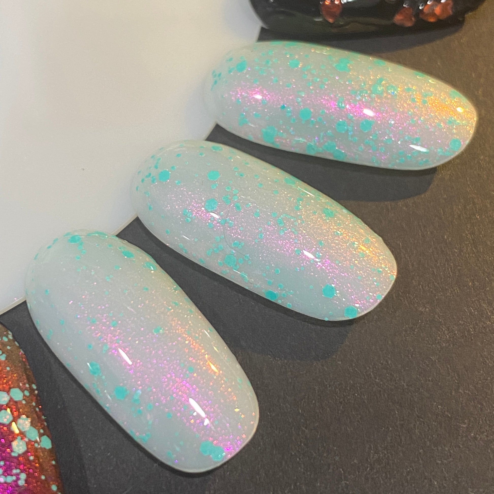 Bakelite is a topper with bright pink to red to orange to gold to green shifting shimmer and multi-sized sea green glitters in a clear base.