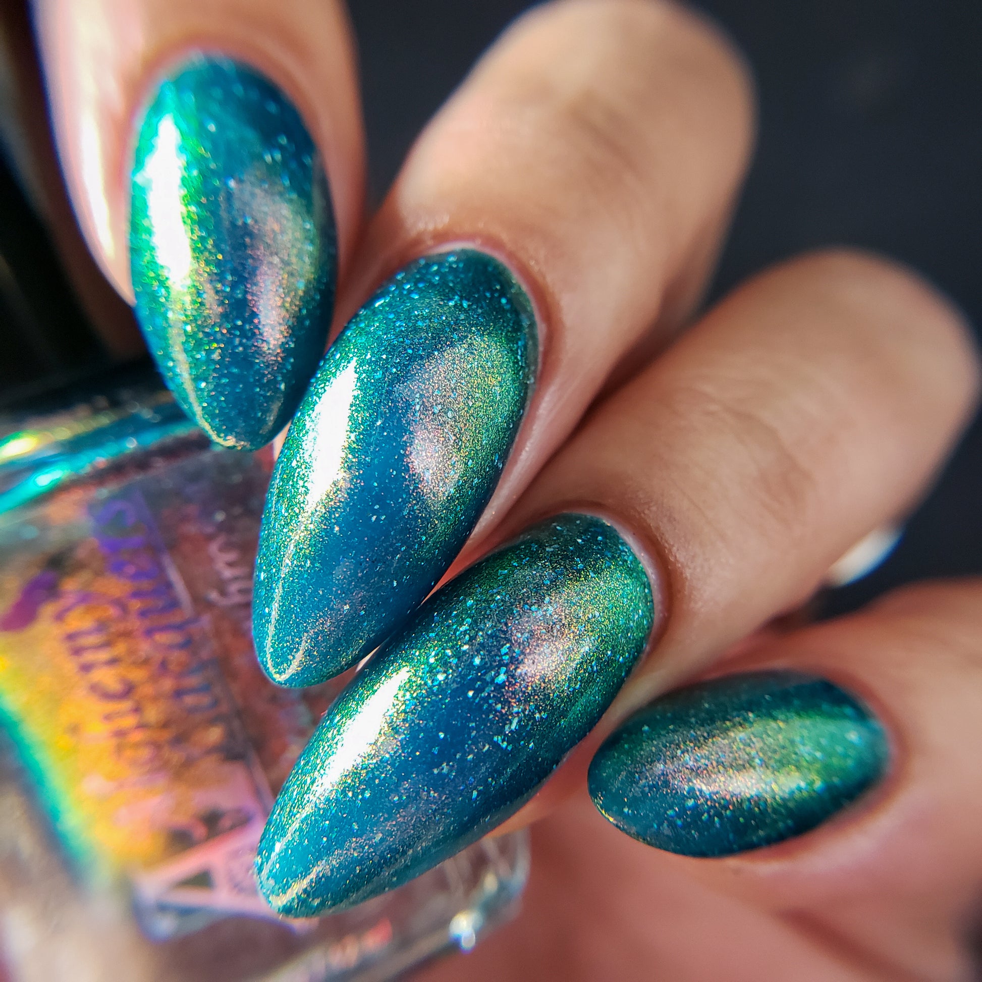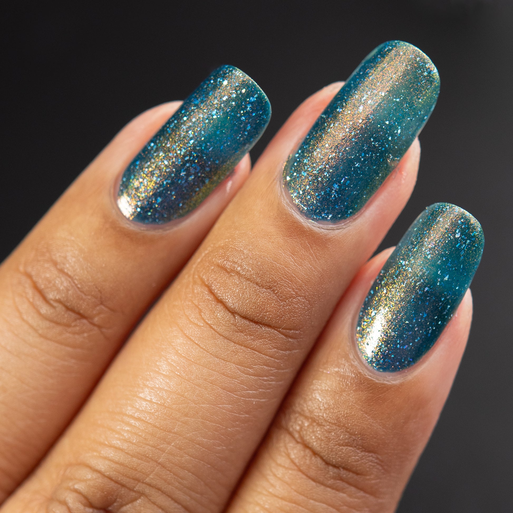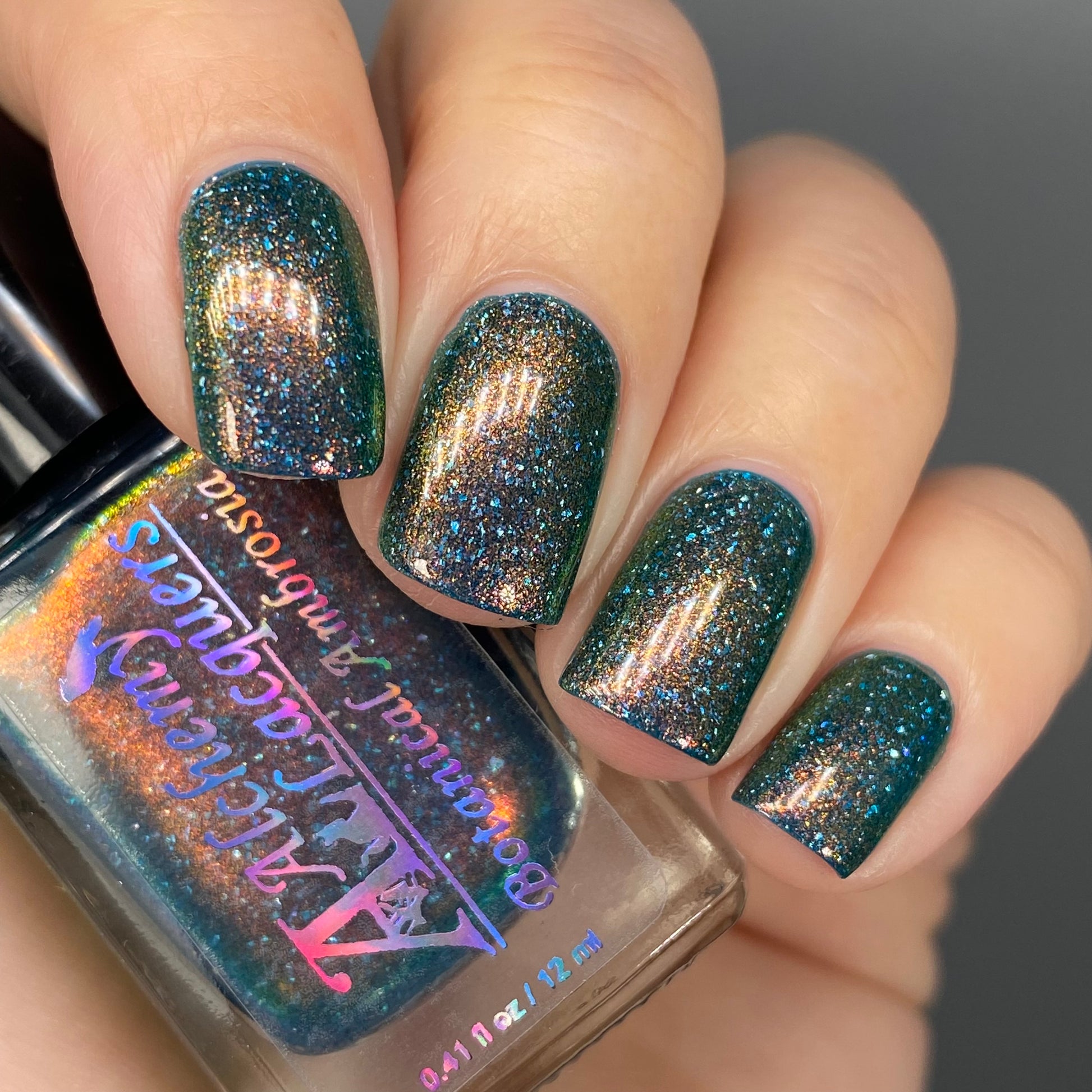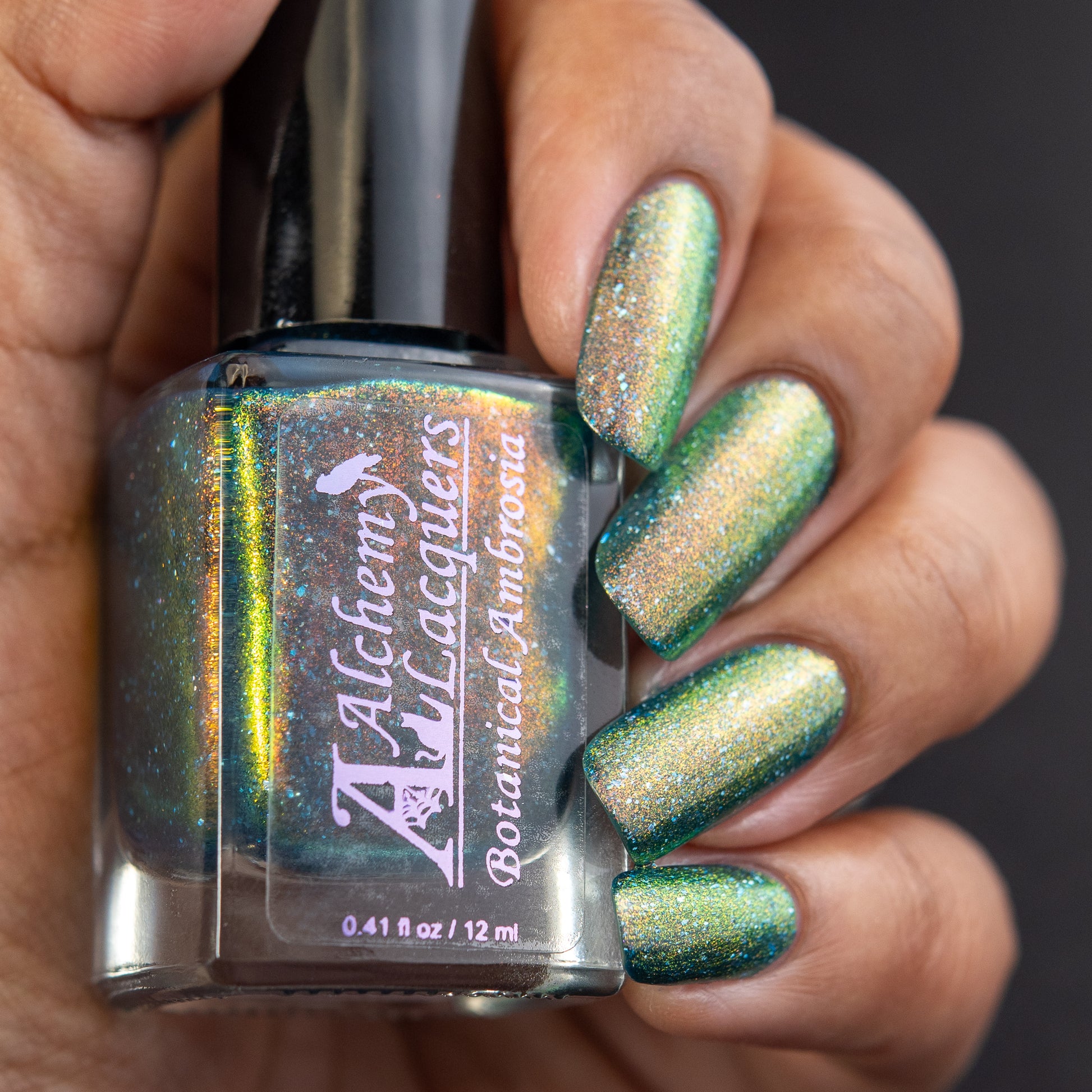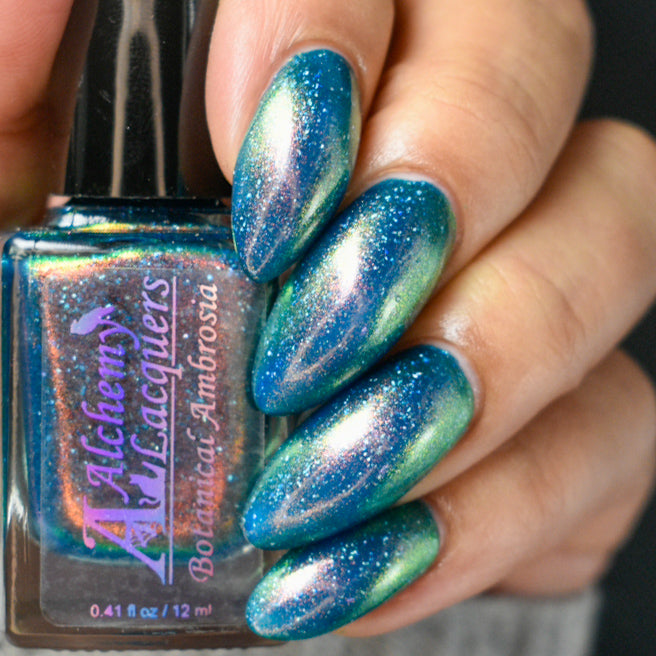 Botanical Ambrosia is a divine nectar made only from the rarest of plants! Said to have actually been divined from the corpse flower itself (but with none of the smell)! Botanical Ambrosia is a darkened teal jelly nail lacquer with red to orange to gold to green shifting shimmer and holographic flakes. Botanical Ambrosia is part of the Alchemist's Vault collection.