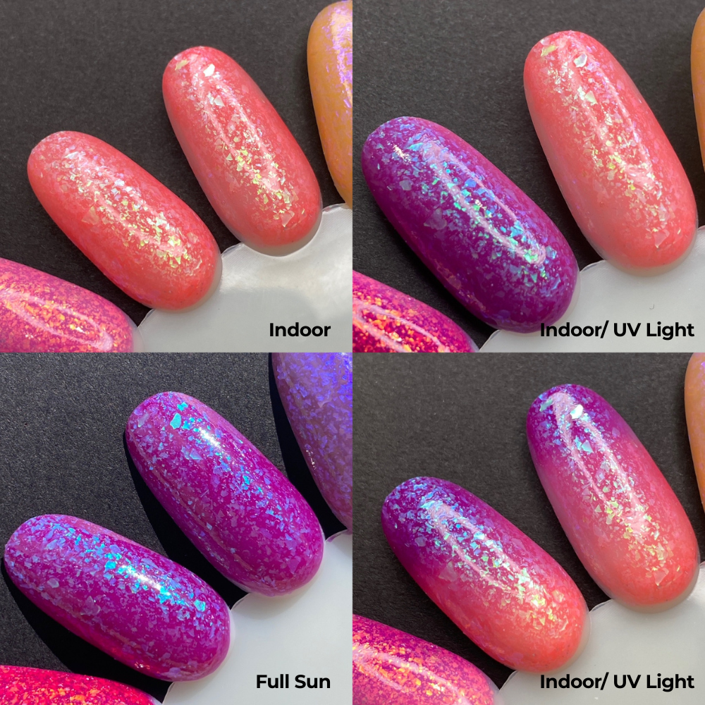 Solar nail lacquers will change colors in sun light. As such, there are a lot of variables that factor into those changes. The transition can depend on the intensity of direct sunlight (just like thermal nail lacquer depend on body temperature). There can be a range of shade changes depending on light intensity levels; the brighter the sun, the more dramatic the transition.