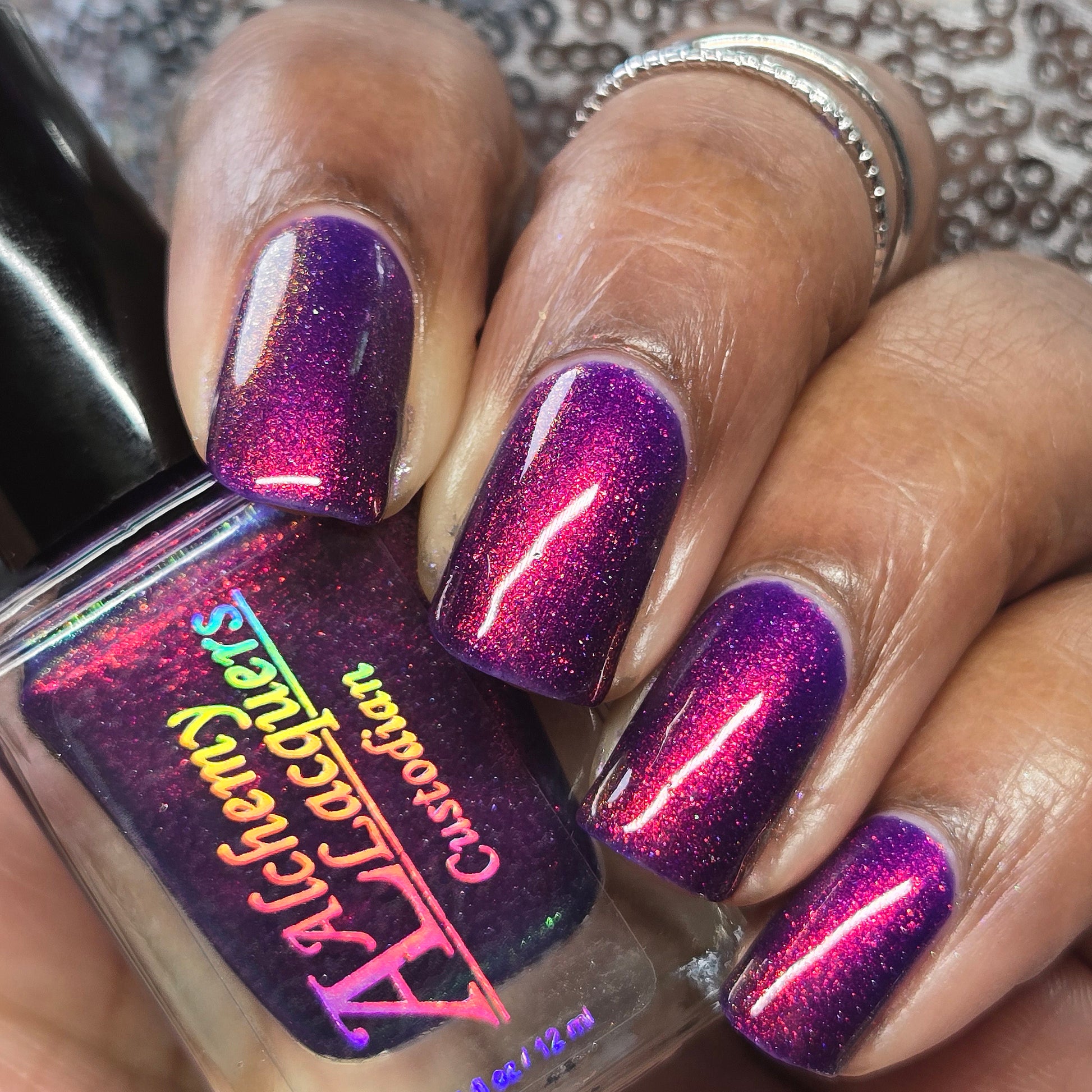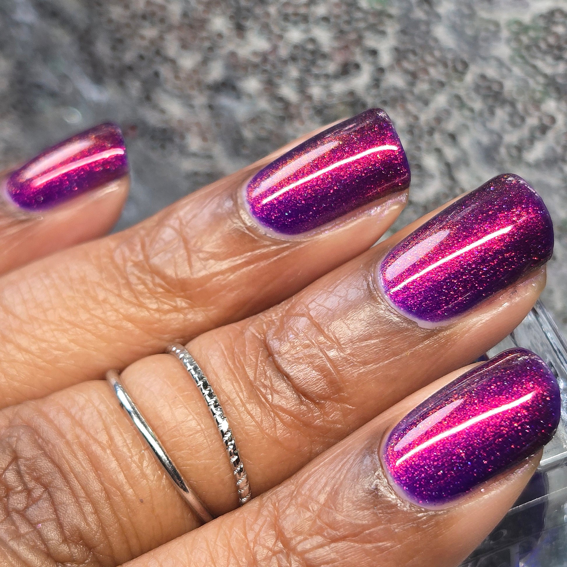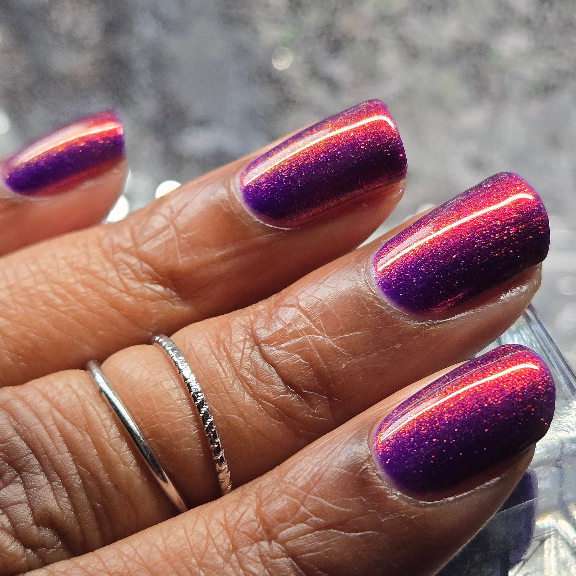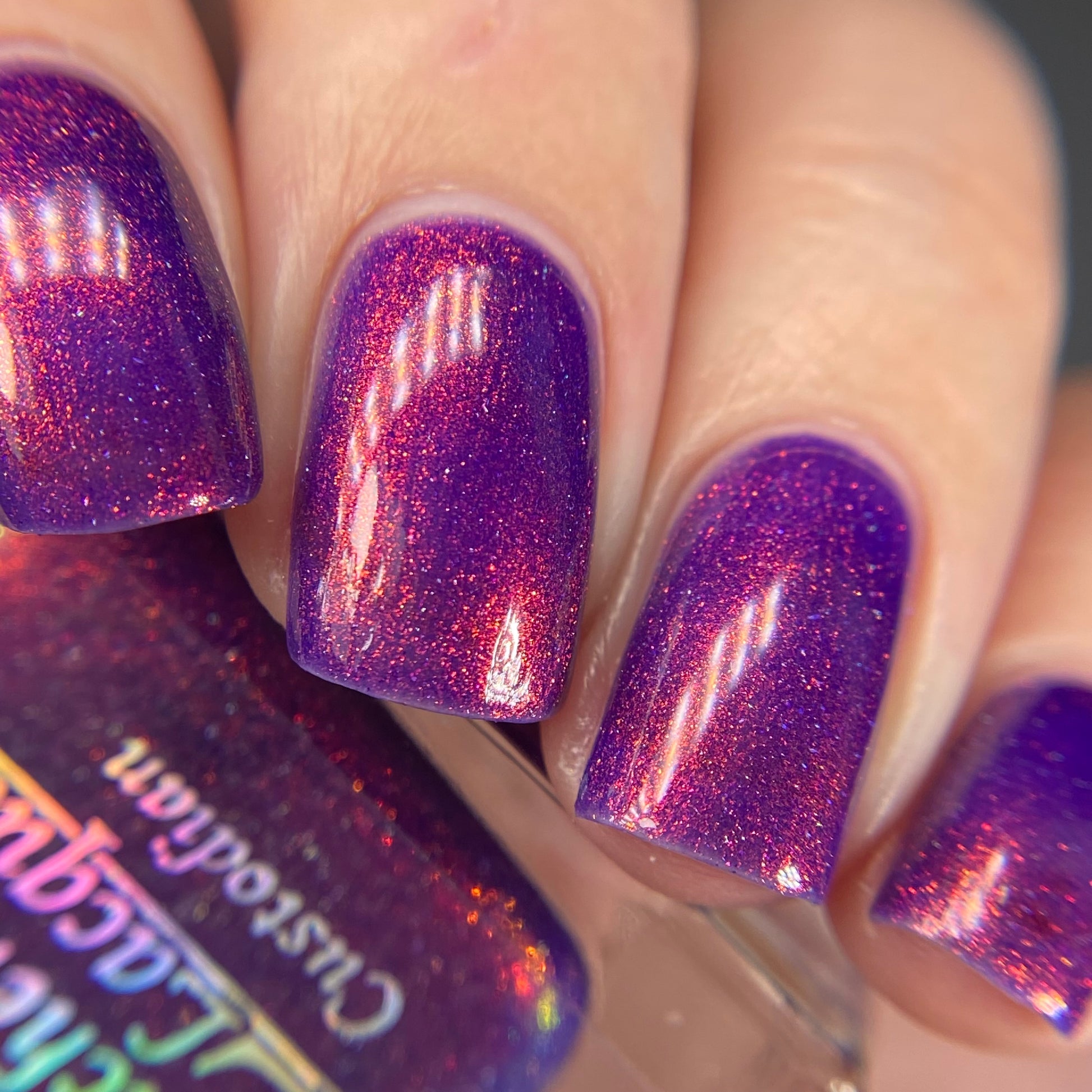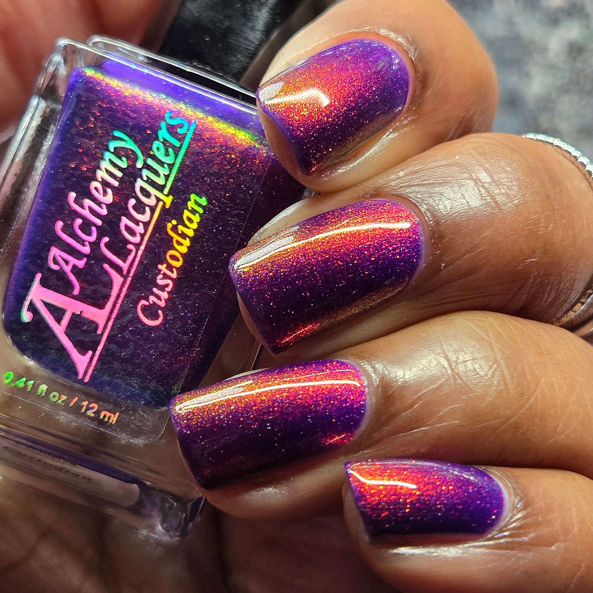 Custodian is a bright violet jelly nail lacquer with red to orange to gold shifting iridescent shimmer and a touch of holographic shimmer.