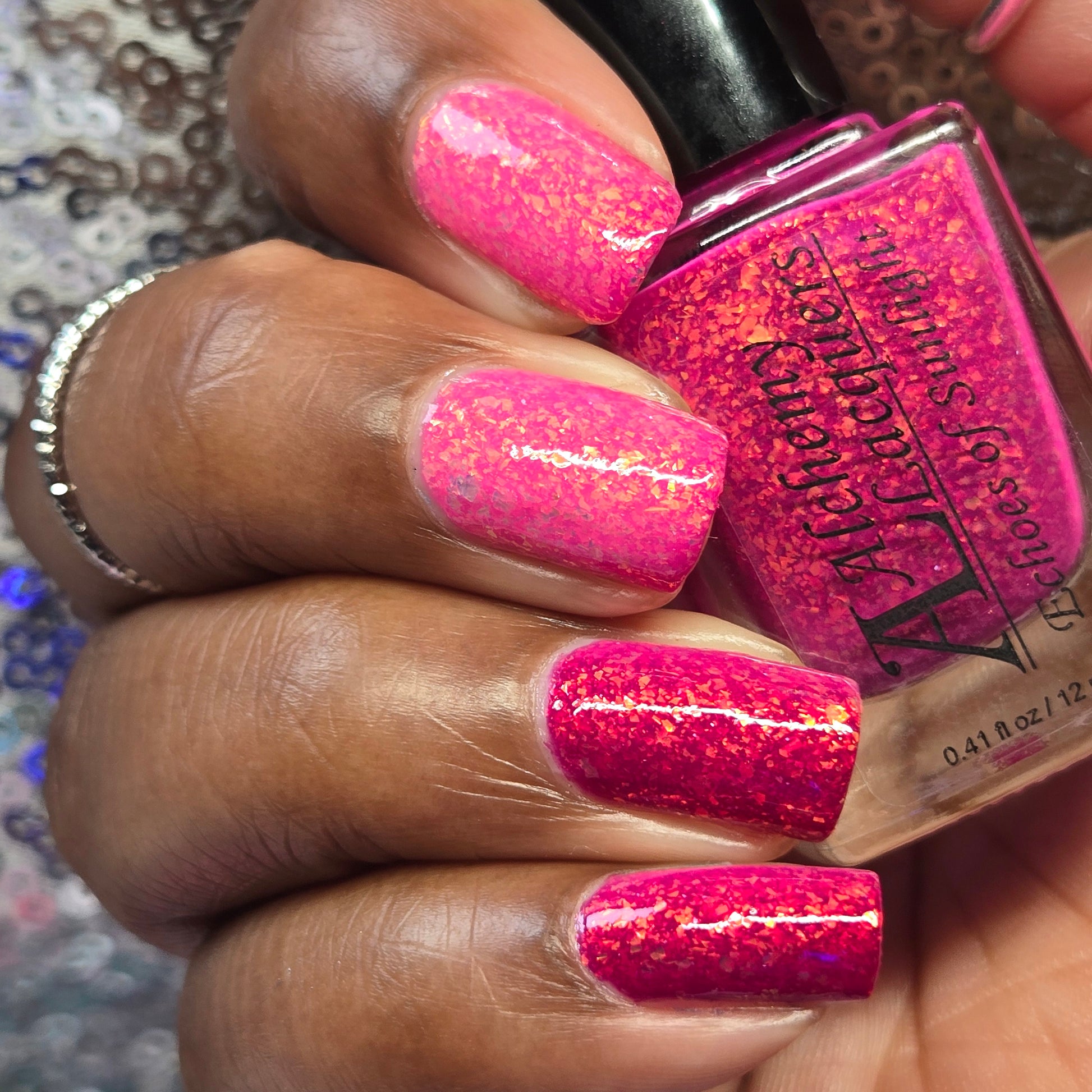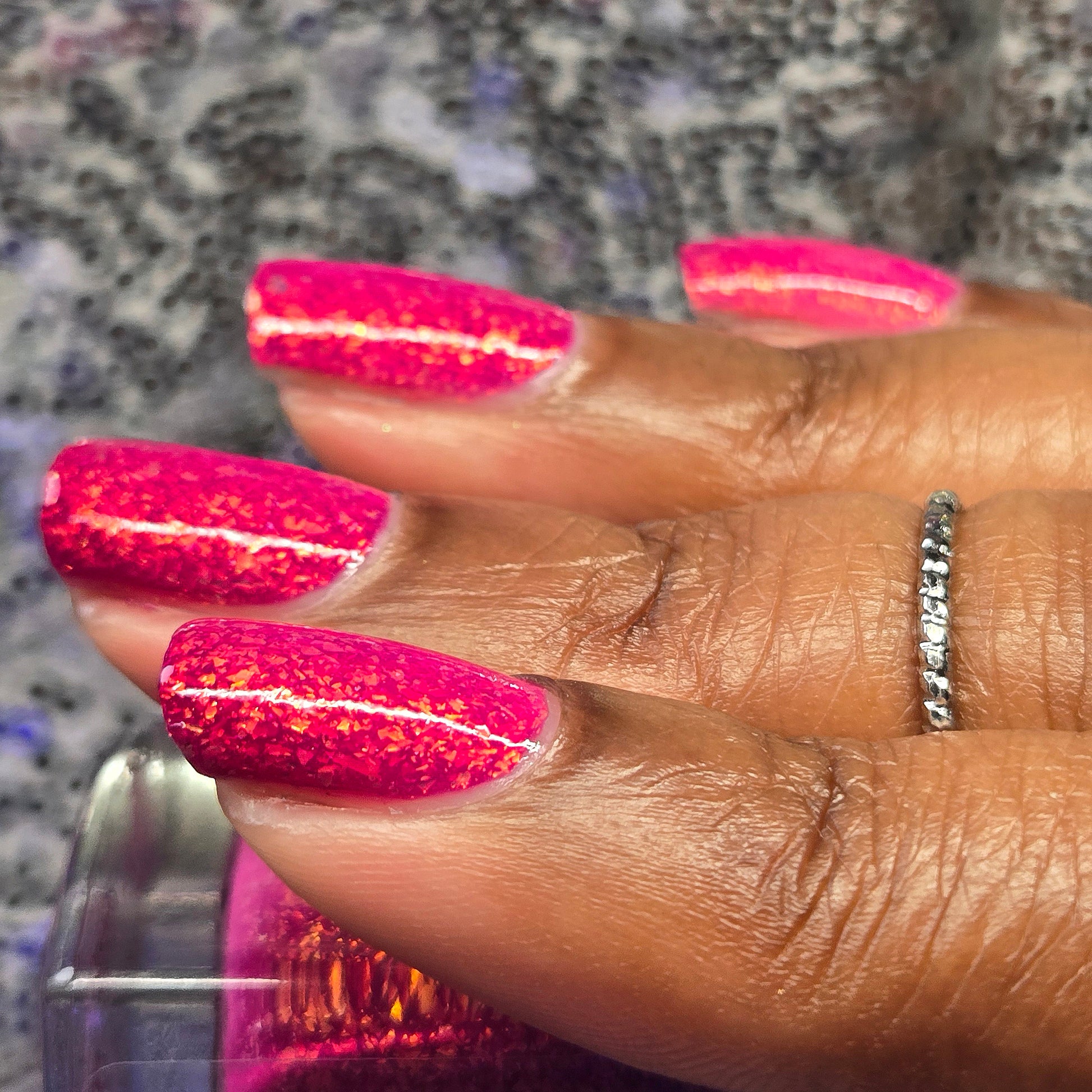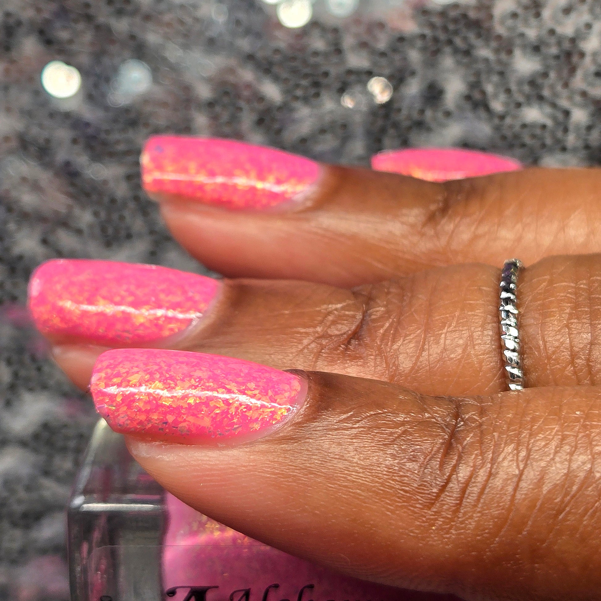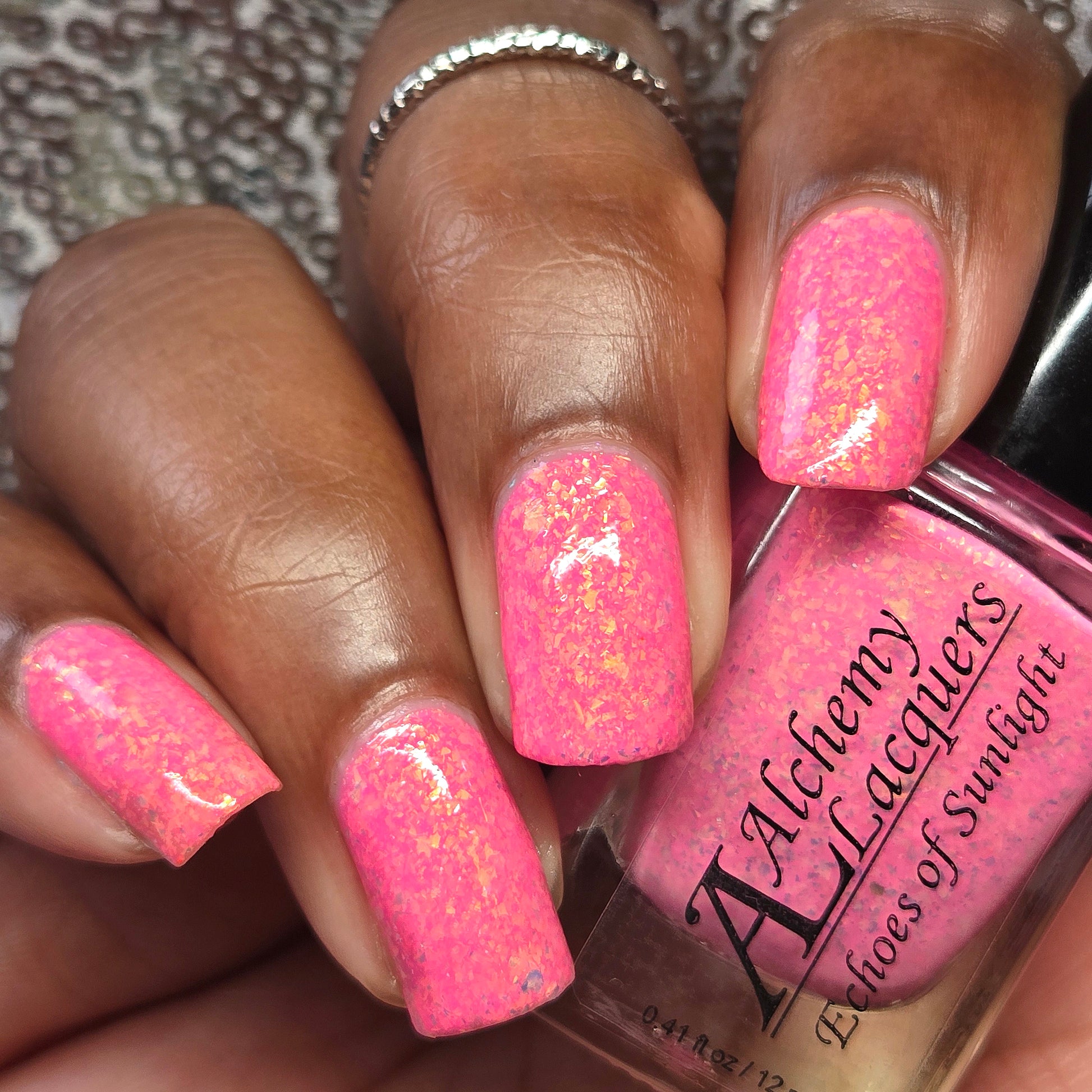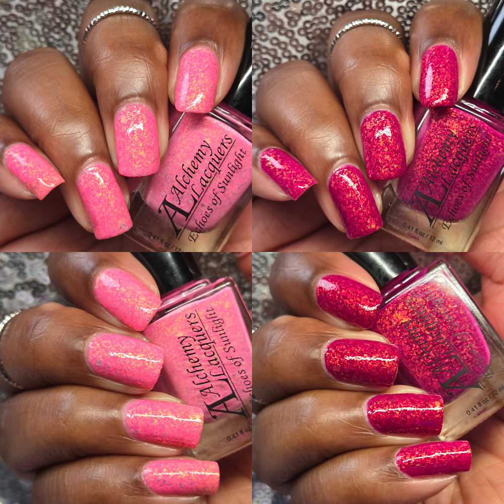 Echoes of Sunlight is a solar nail lacquer that shifts from bubblegum pink (shade) to magenta (sun) with contrasting orange to gold shifting iridescent flakes.. Echoes of Sunlight is part of the Shards of Illumination Collection.
