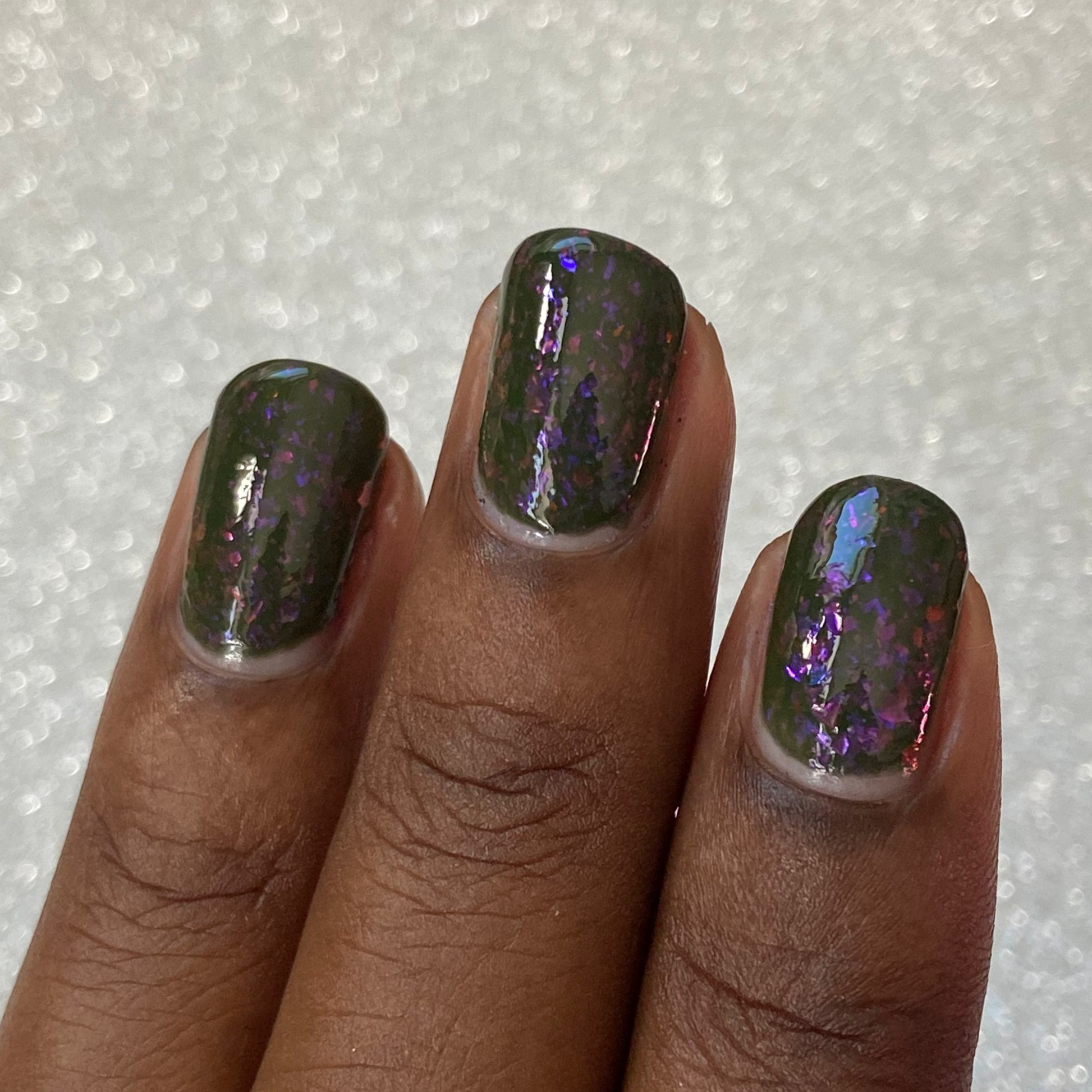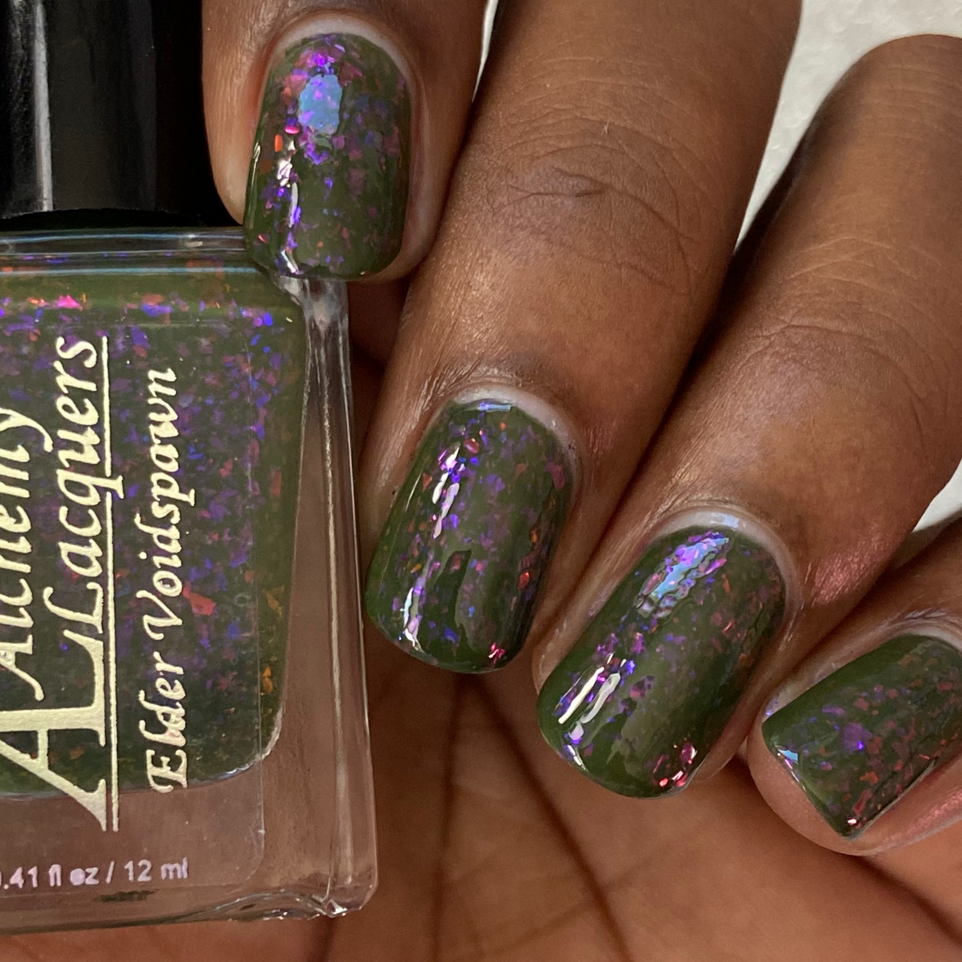 Elder Voidspawn is an olive-green crelly nail lacquer with purple to red to pink iridescent shifting flakes. Elder Voidspawn is part of the Stellar Guardians Collection.