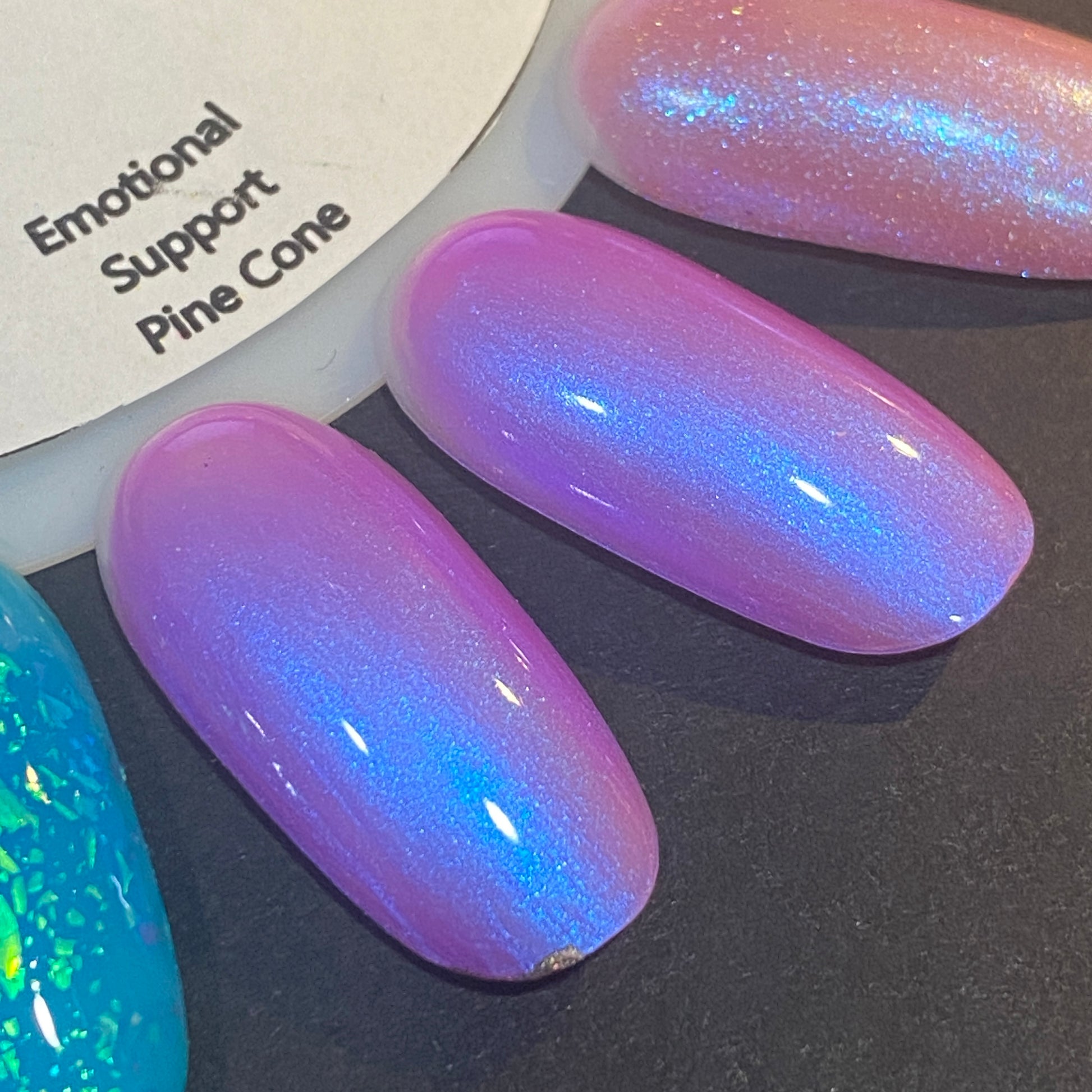 Emotional Support Pinecone is a violet jelly nail lacquer with contrasting cyan to blue shifting shimmer. Emotional Support Pinecone is part of La Tannya's Corner, Part 2 Collection.