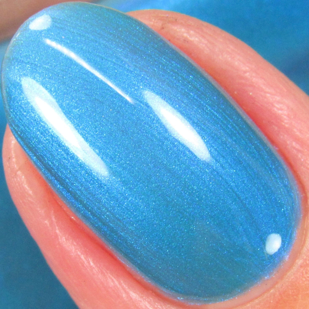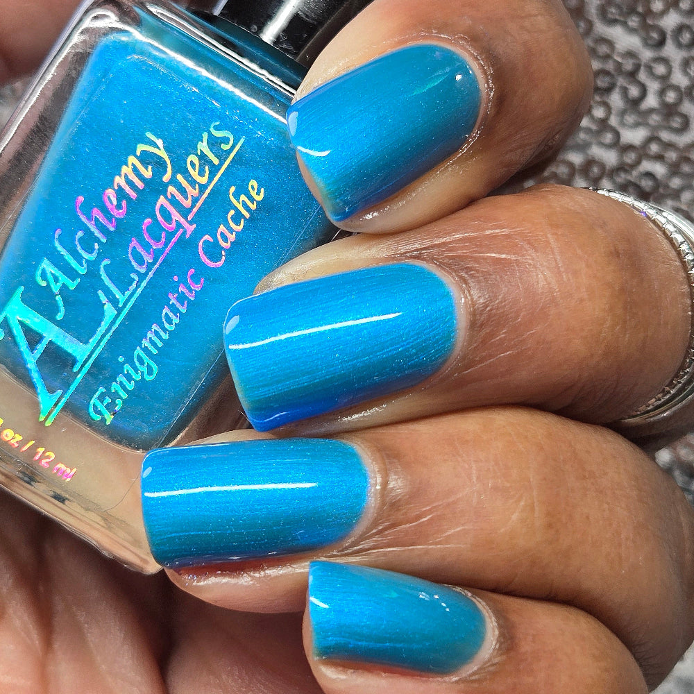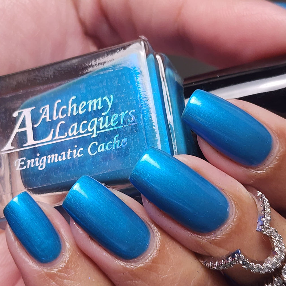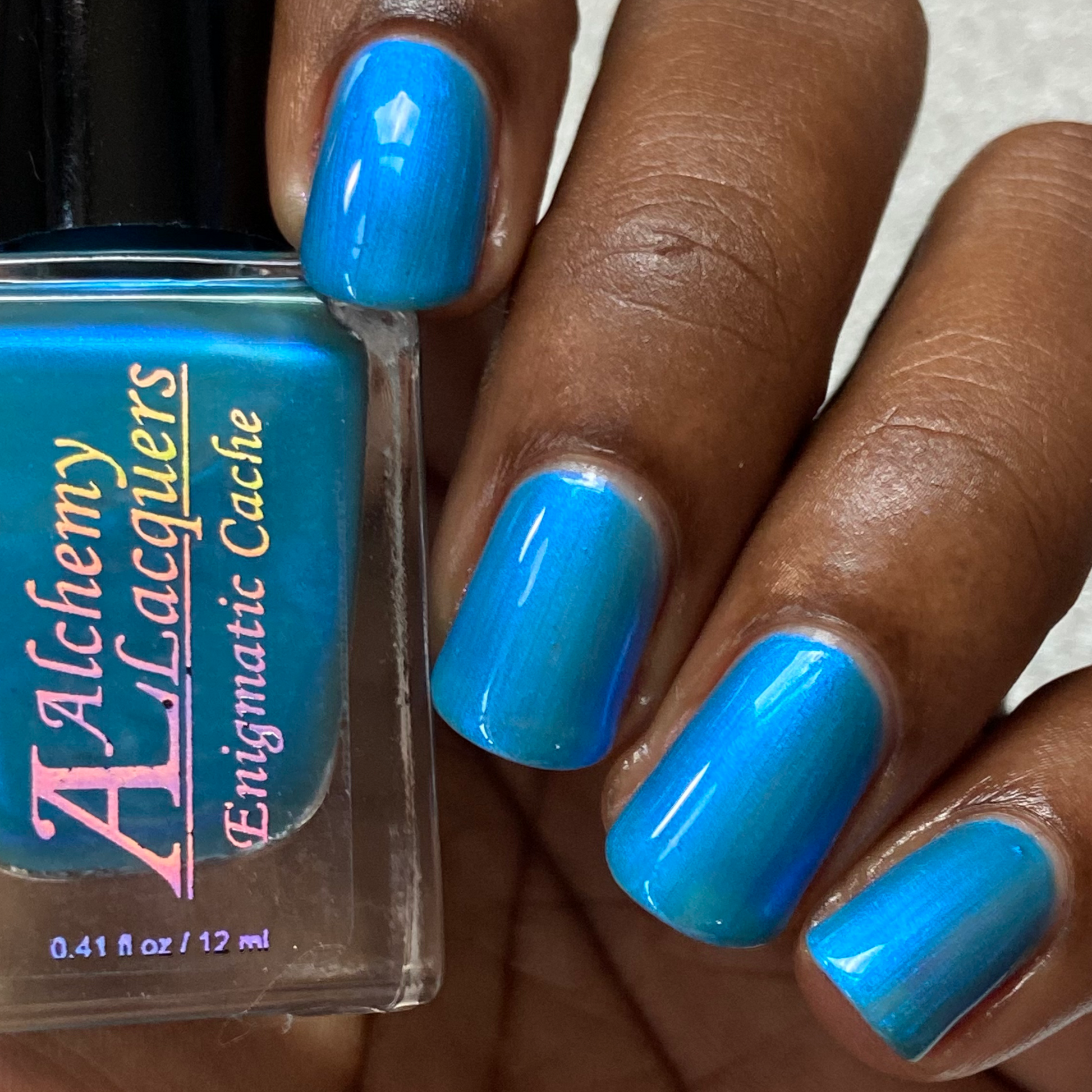 Enigmatic Cache is a sage green jelly nail lacquer with cyan to blue shifting iridescent shimmer. This is a sibling to emotional support taco and pinecone. Enigmatic Cache is part of the Stellar Guardians Collection.