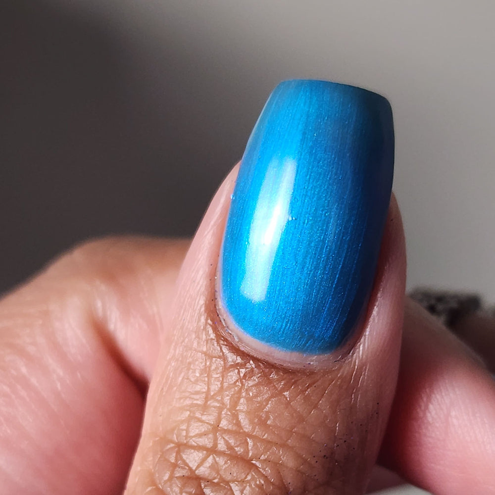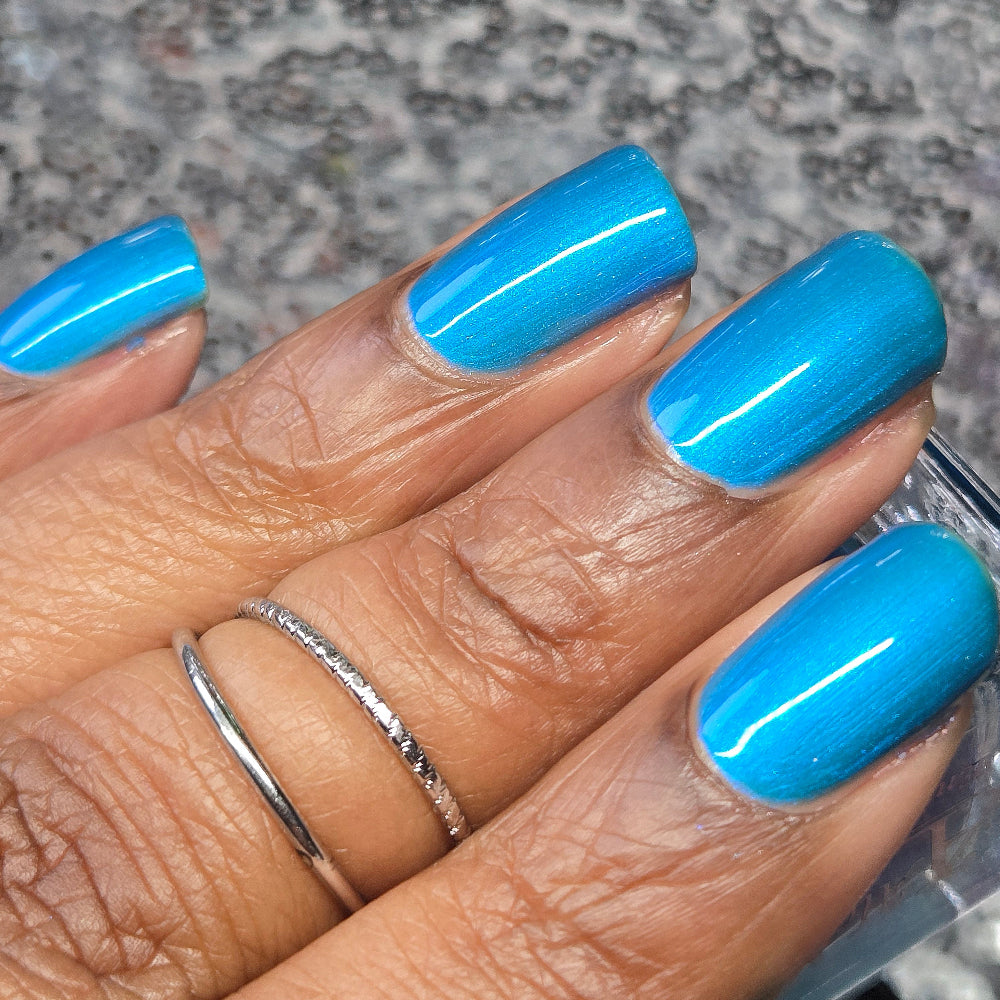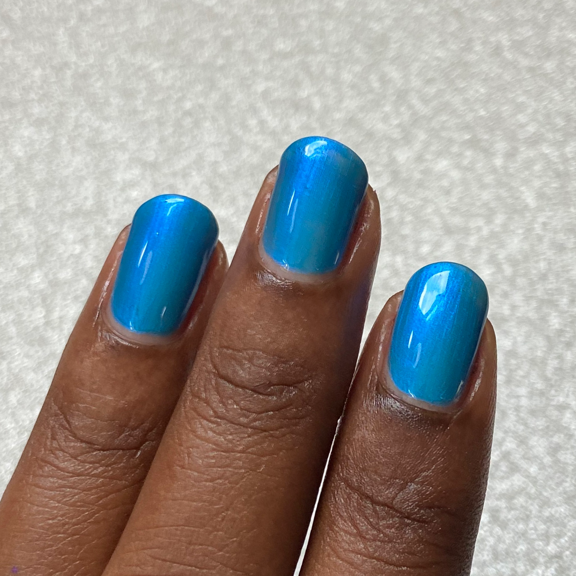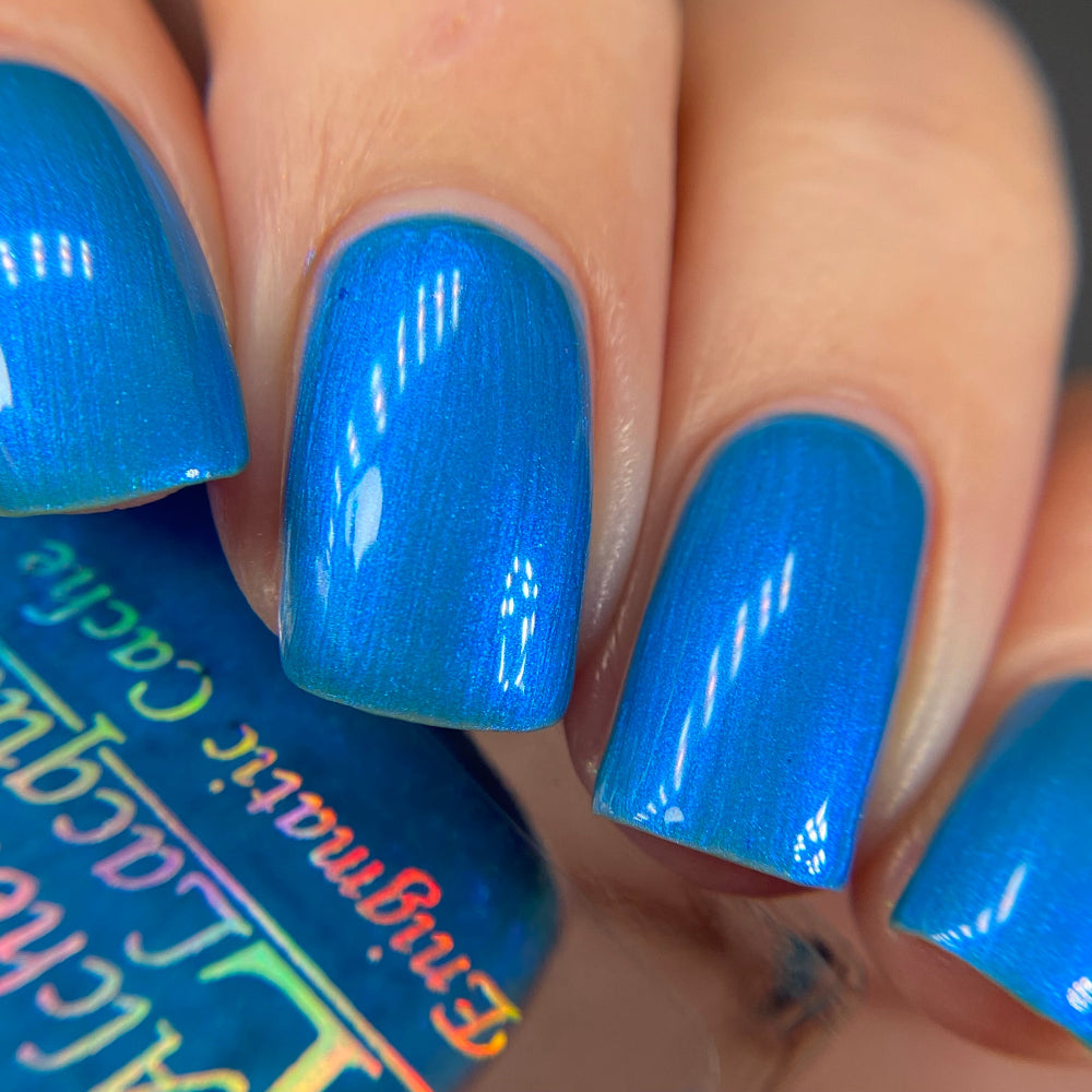 Enigmatic Cache is a sage green jelly nail lacquer with cyan to blue shifting iridescent shimmer. This is a sibling to emotional support taco and pinecone. Enigmatic Cache is part of the Stellar Guardians Collection.