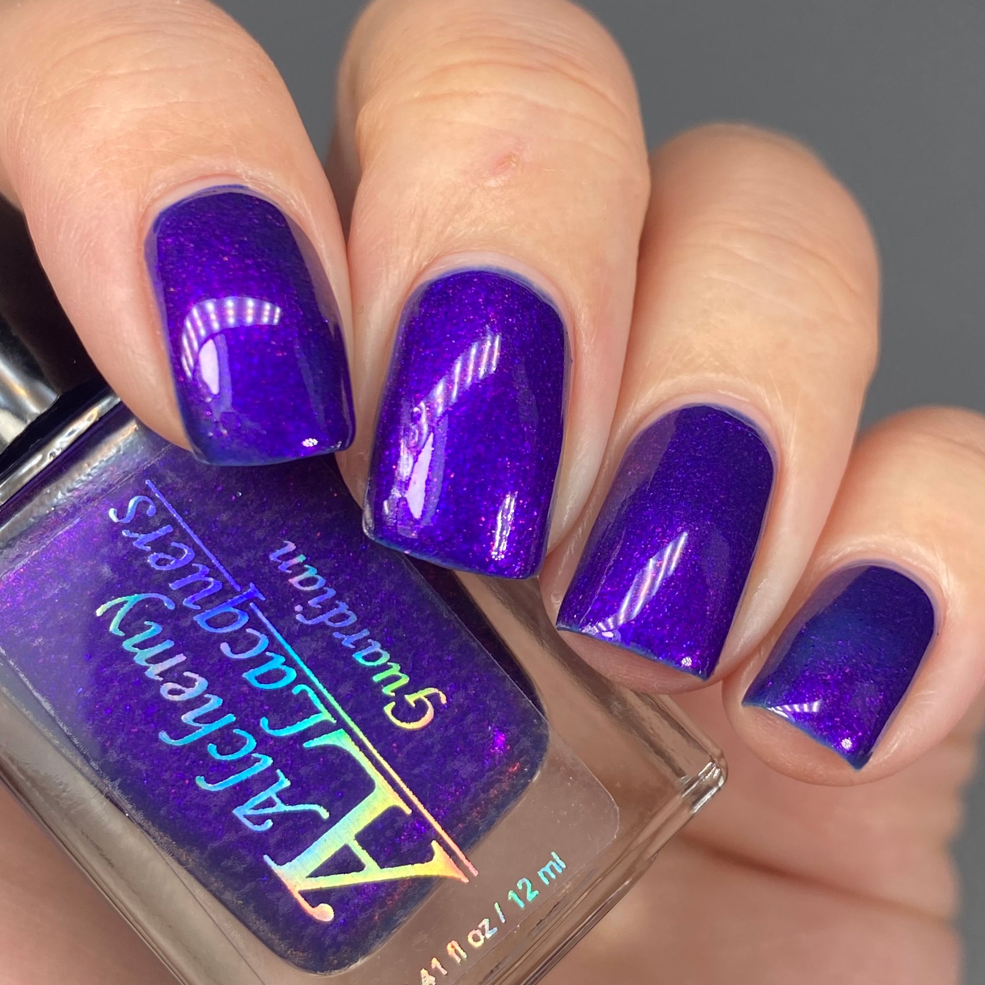 Guardian is a deep blue jelly nail lacquer with purple to pink shifting iridescent shimmer.