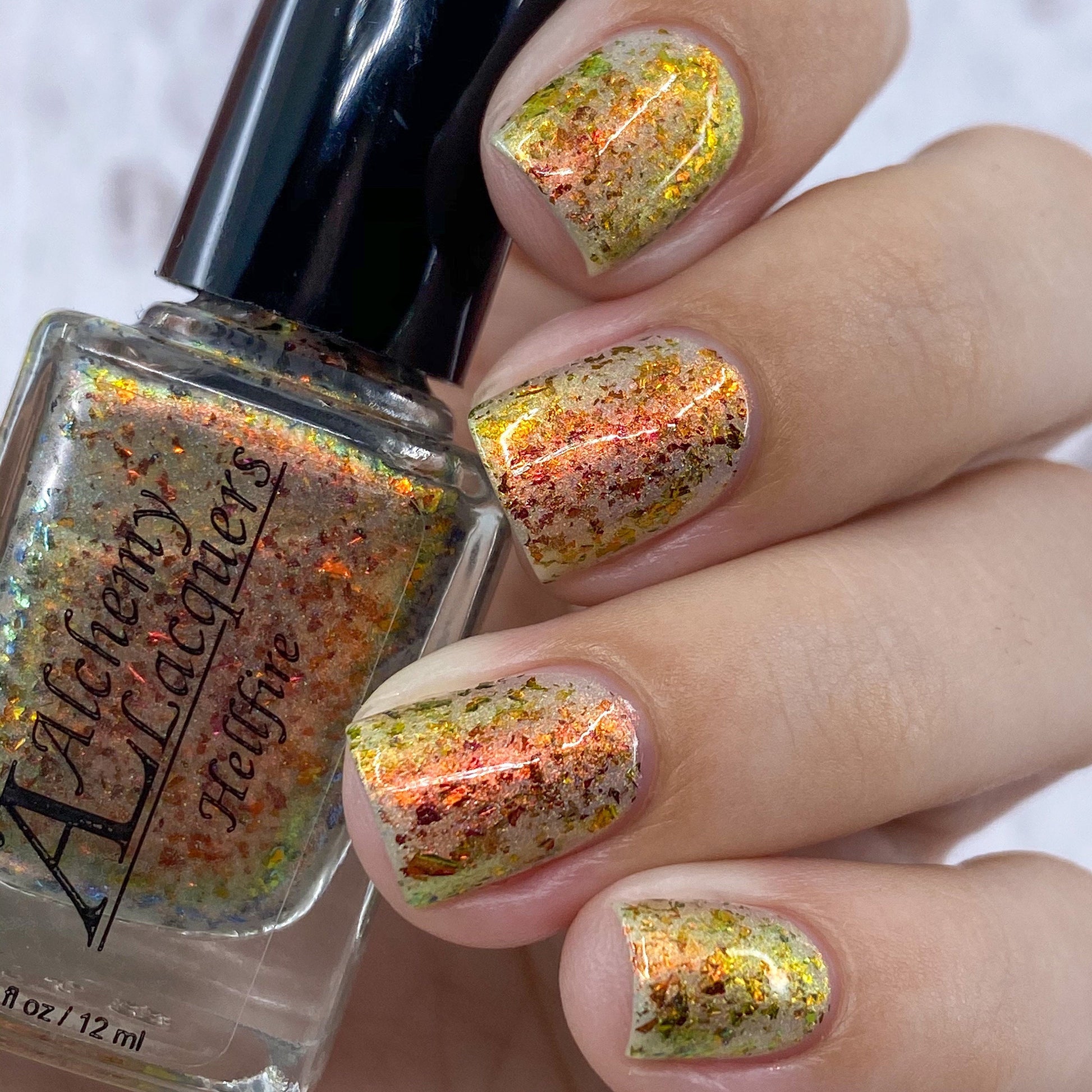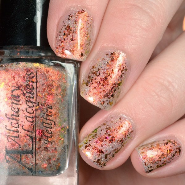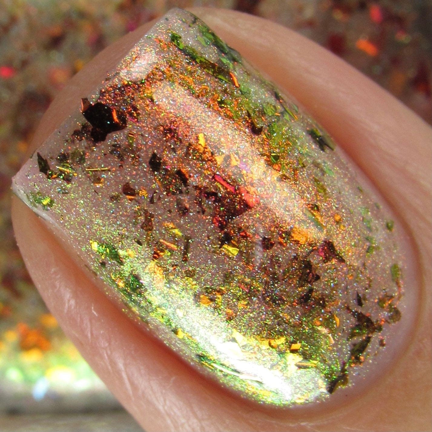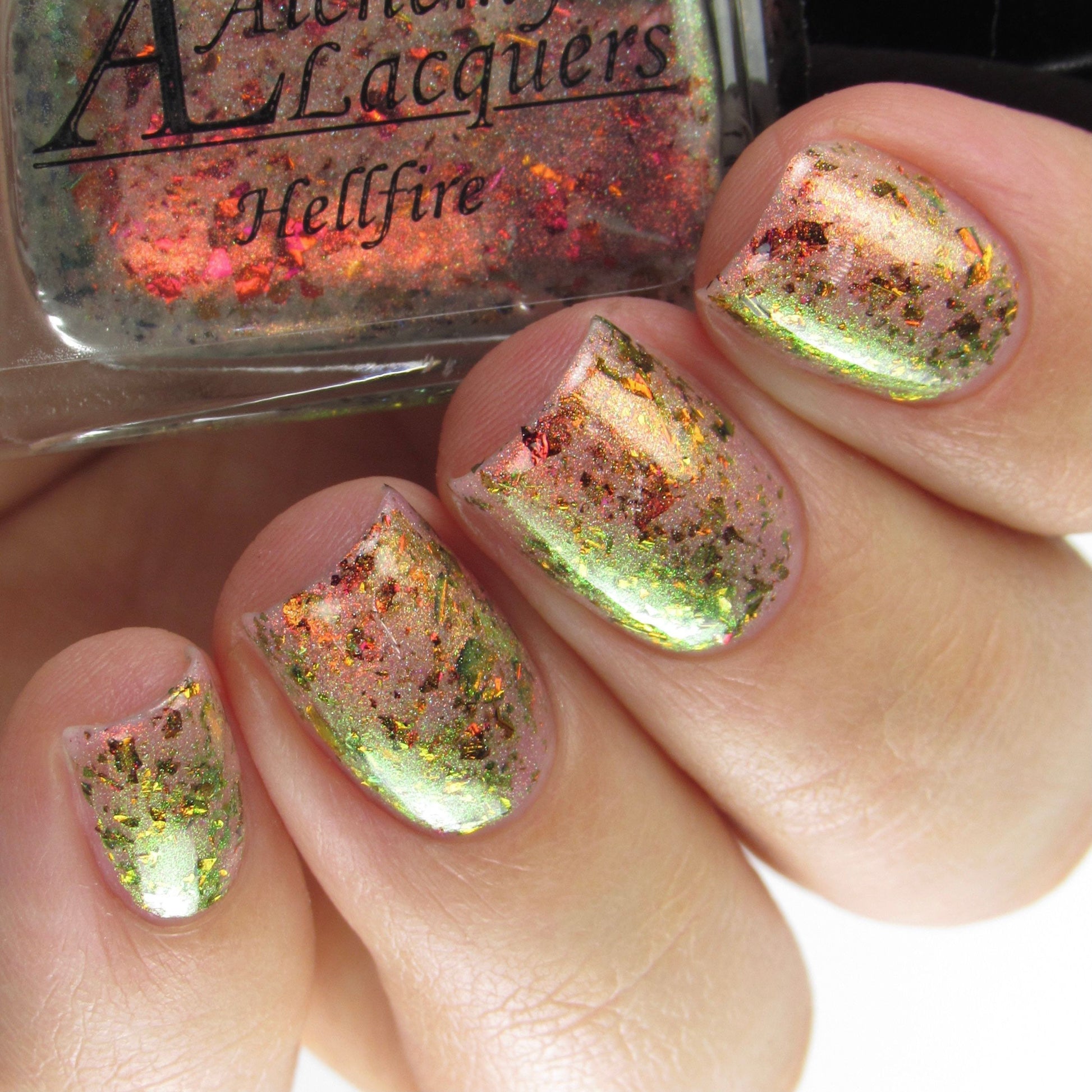 Hellfire is a nail lacquer with red/orange/gold/green/lime shimmer, red/orange/gold/green chrome chameleon flakes with a scattered holographic finish. Can be worn as a nail effect topper or built up in 2-3 coats. Hellfire is part of the Double, Double, Toil & Trouble.