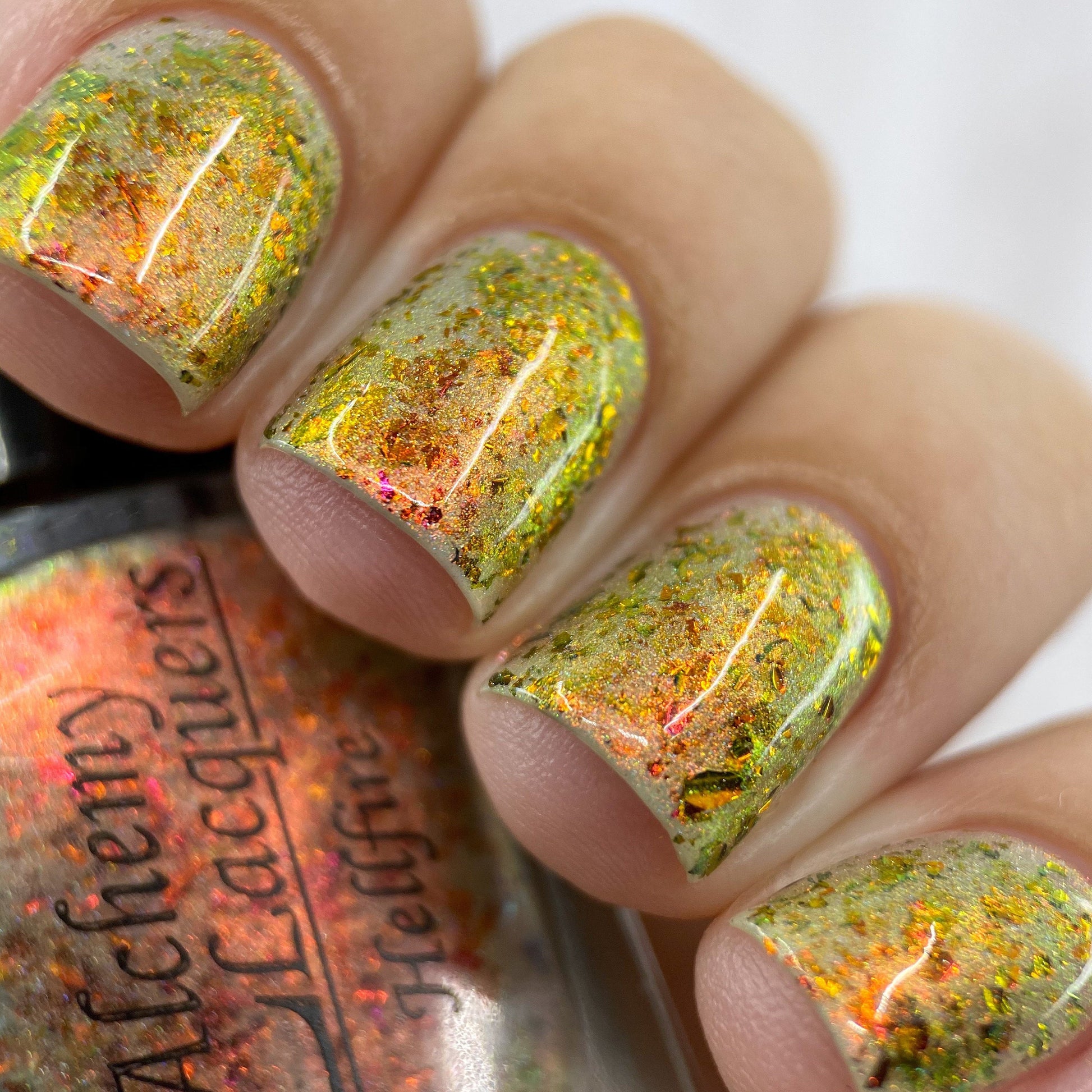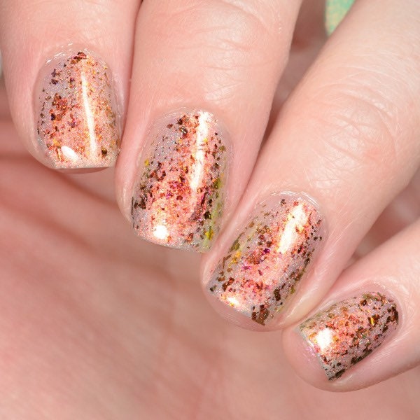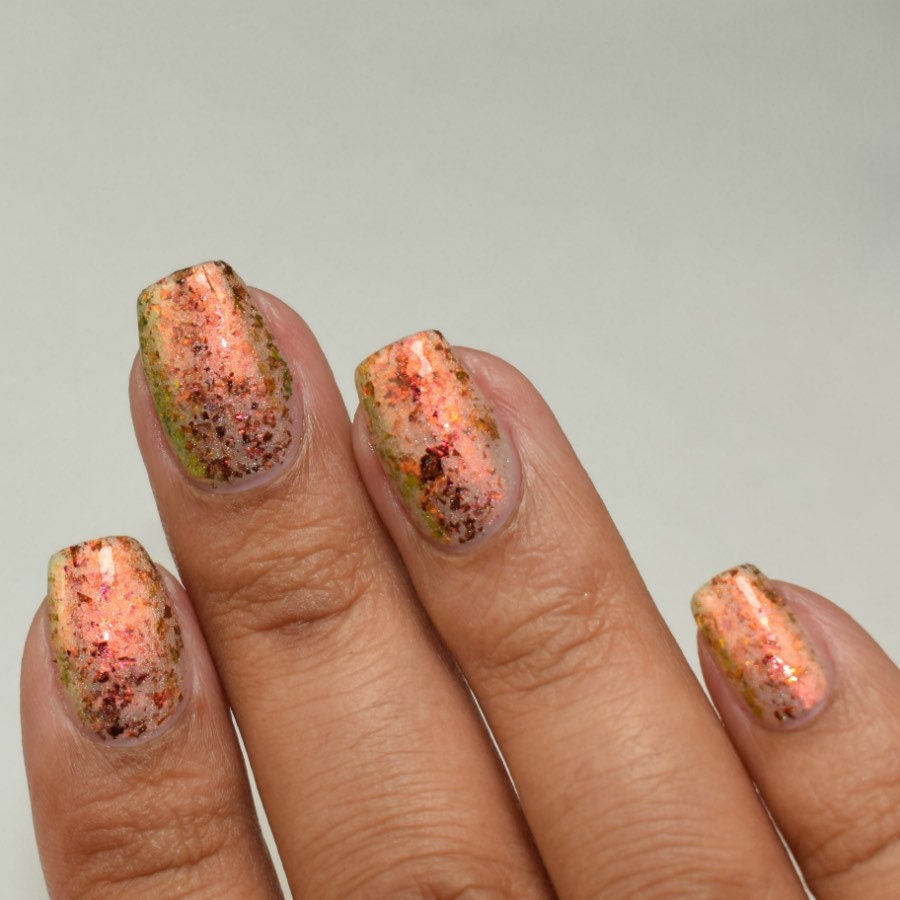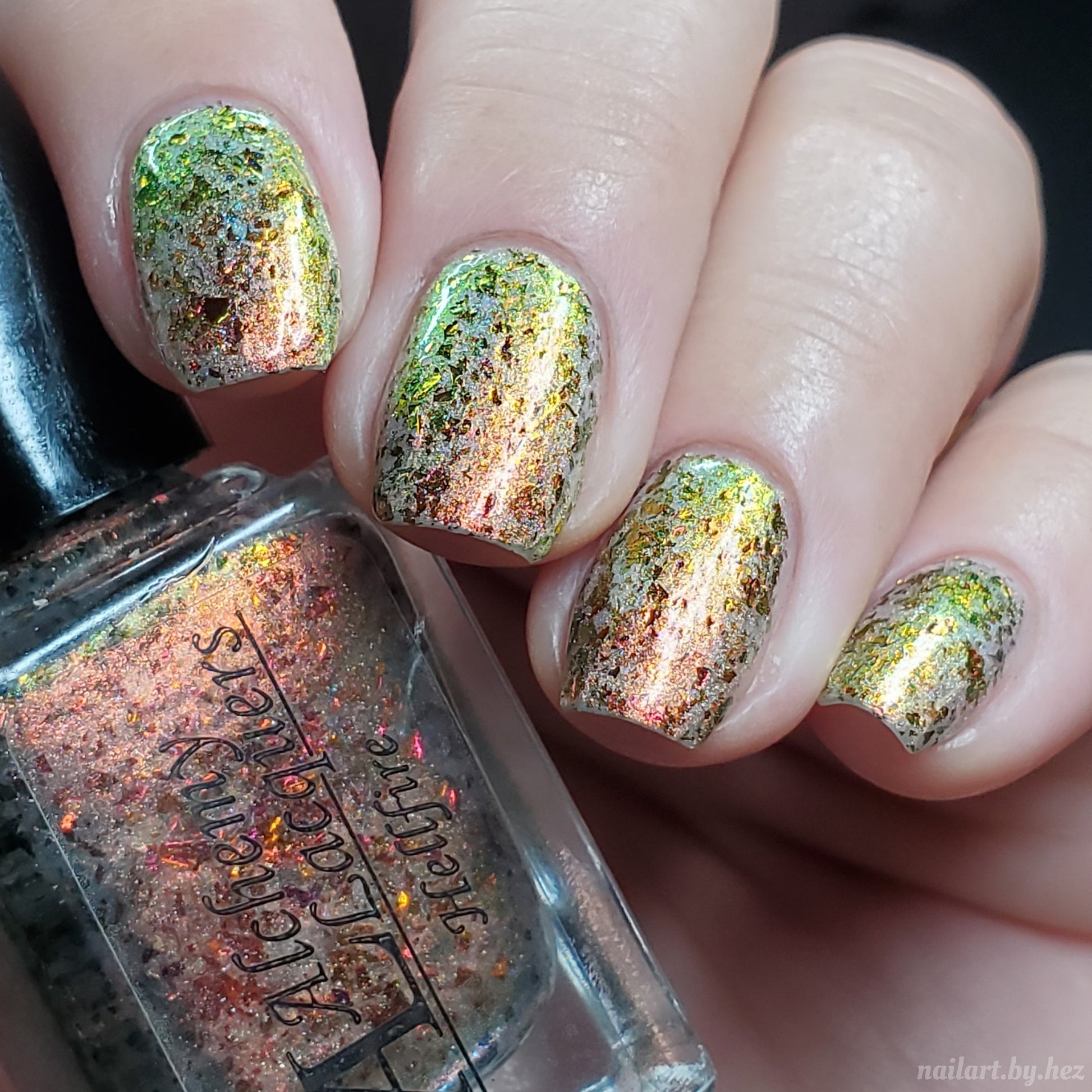 Hellfire is a nail lacquer with red/orange/gold/green/lime shimmer, red/orange/gold/green chrome chameleon flakes with a scattered holographic finish. Can be worn as a nail effect topper or built up in 2-3 coats. Hellfire is part of the Double, Double, Toil & Trouble.