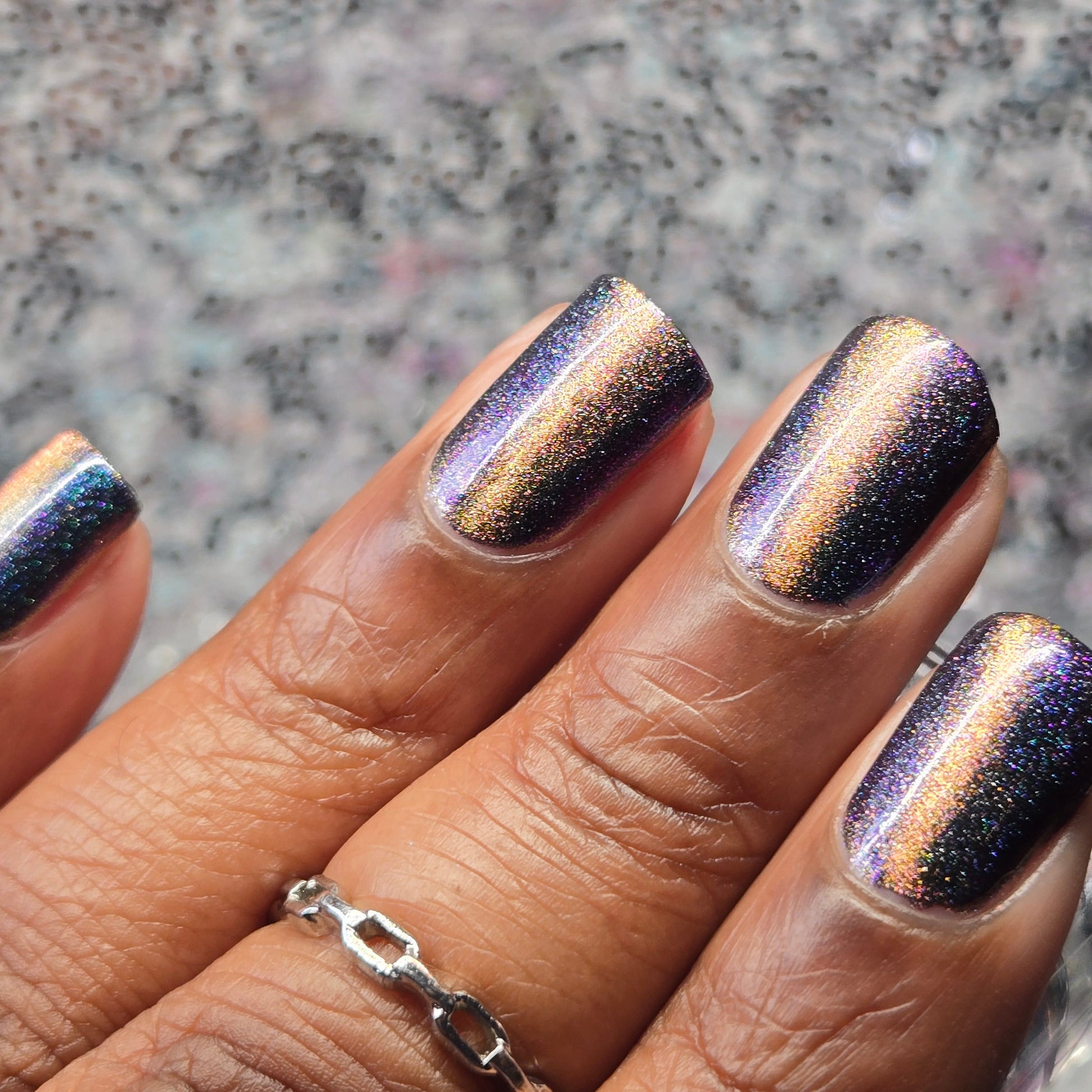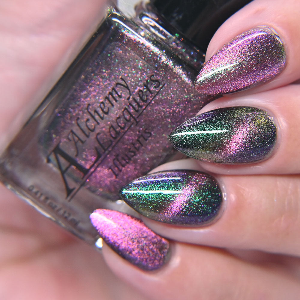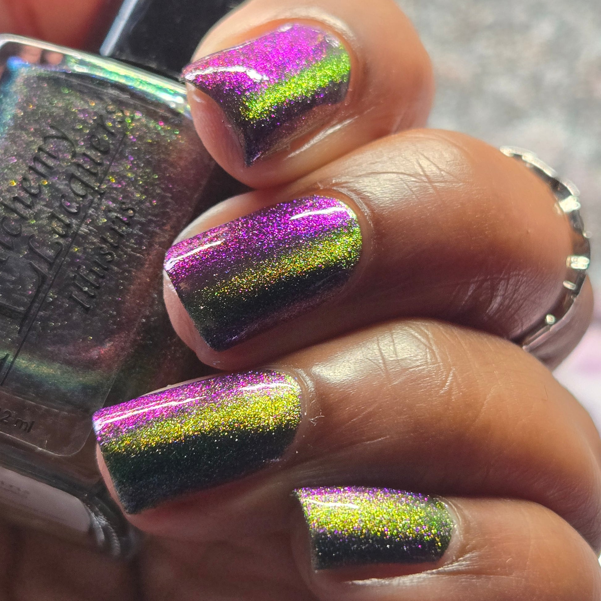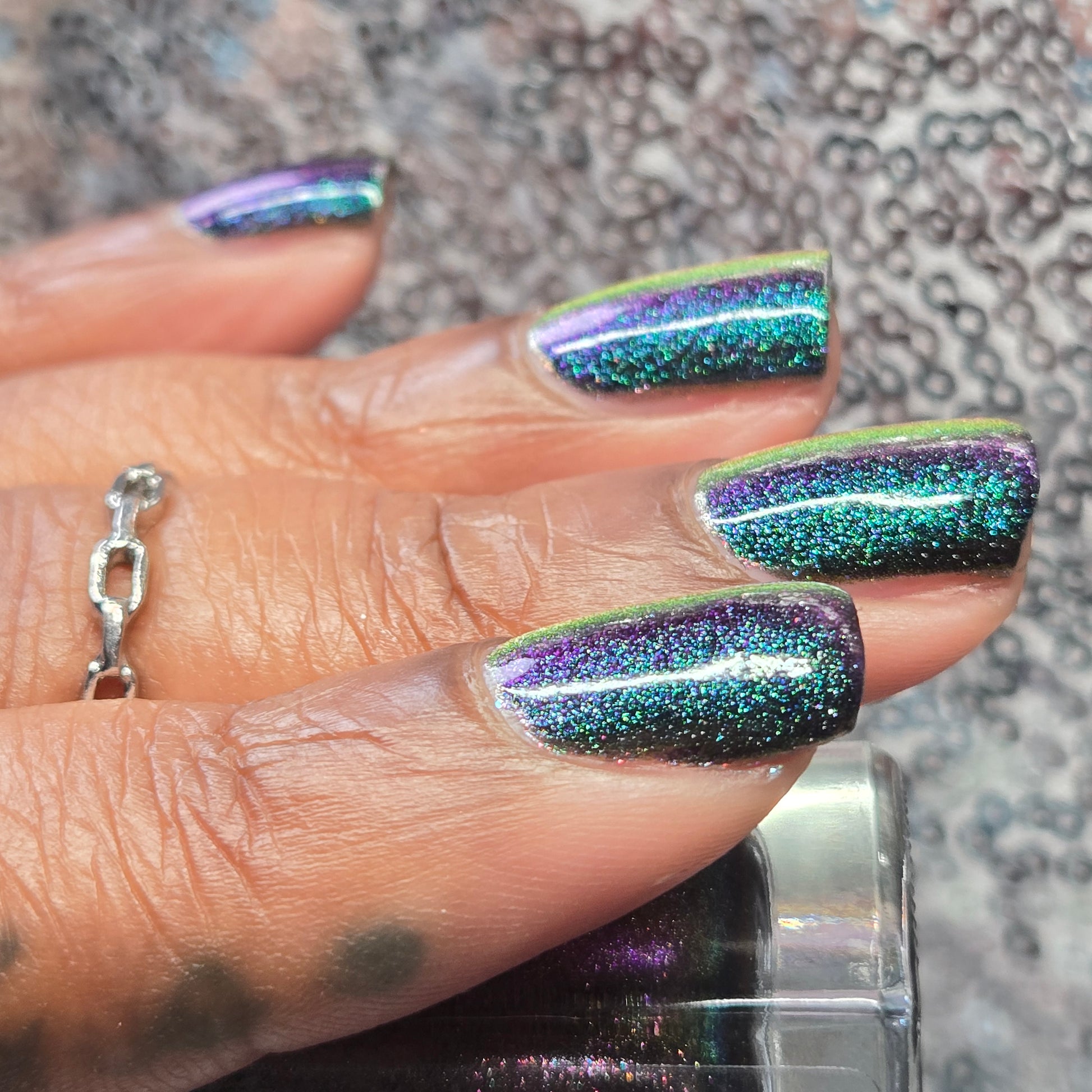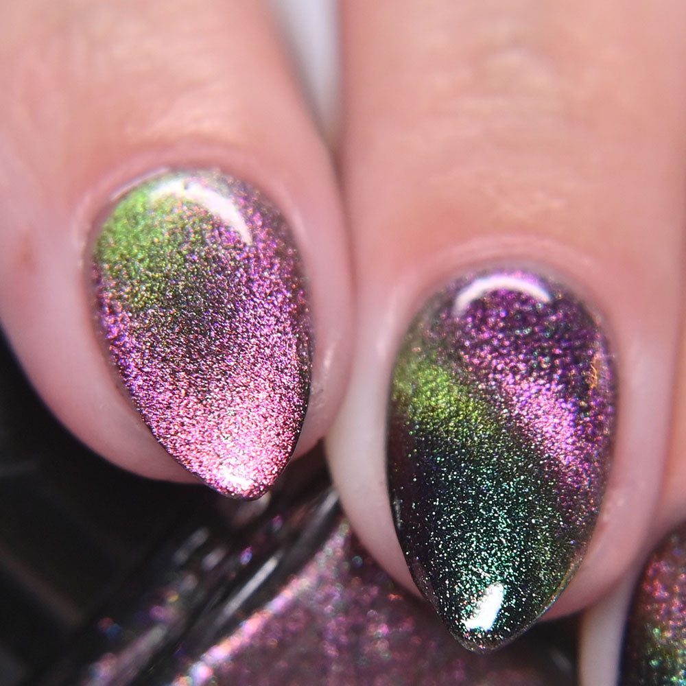 Illustris is a multichrome magnetic nail lacquer that shifts from green to blue to purple with contrasting pink to orange to gold multichrome magnetic shimmer. Illustris is part of the Botanica Collection.
