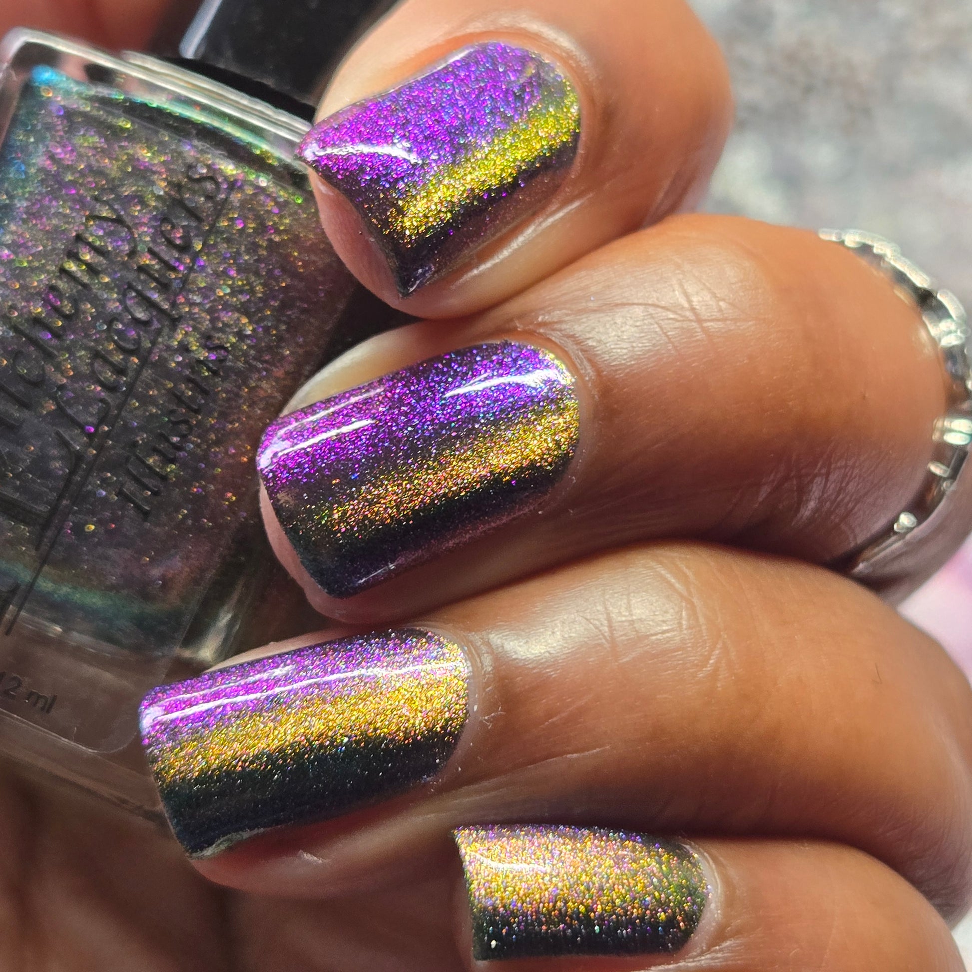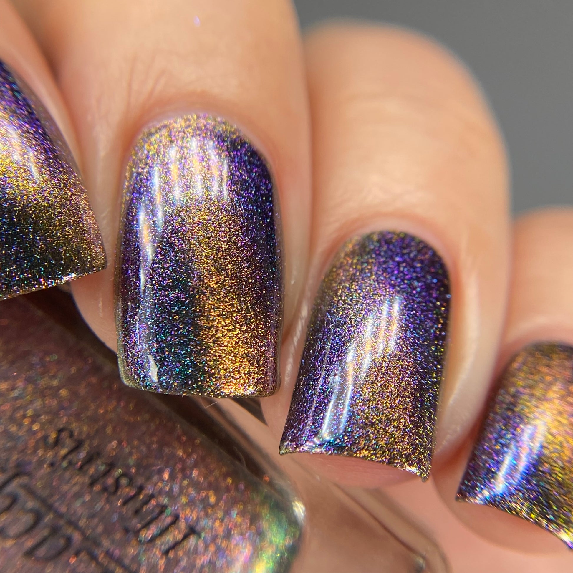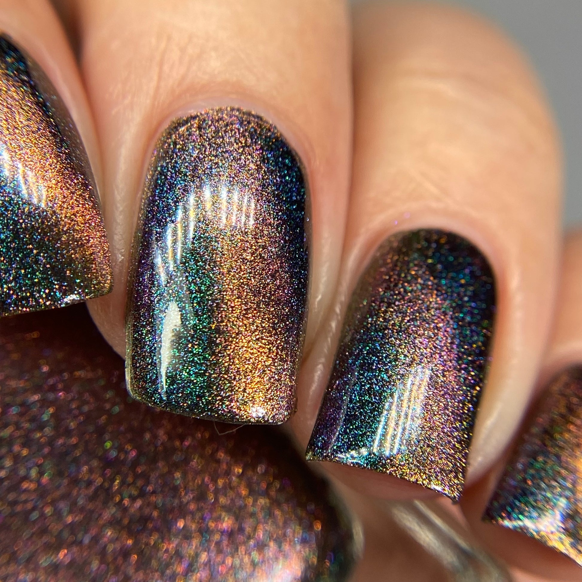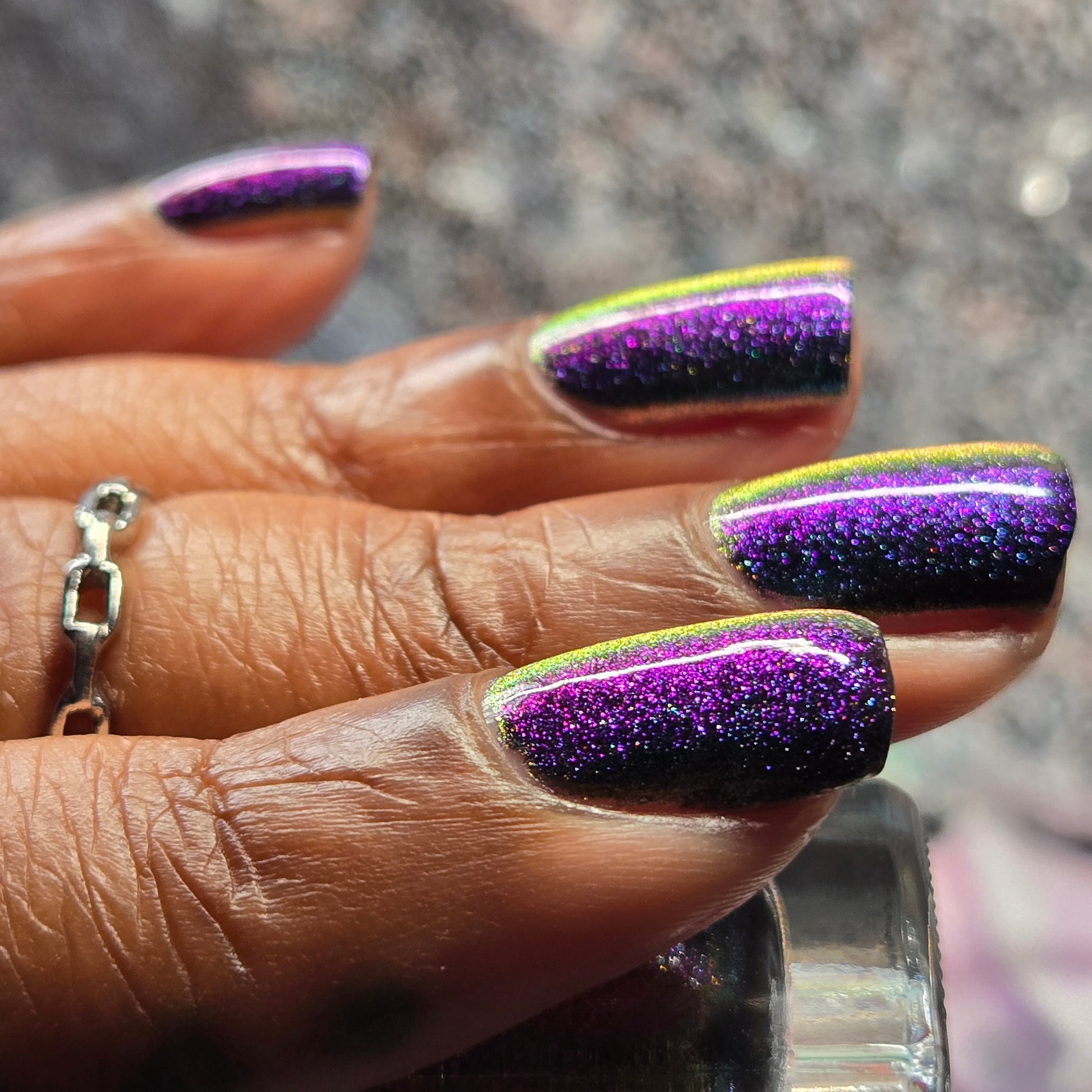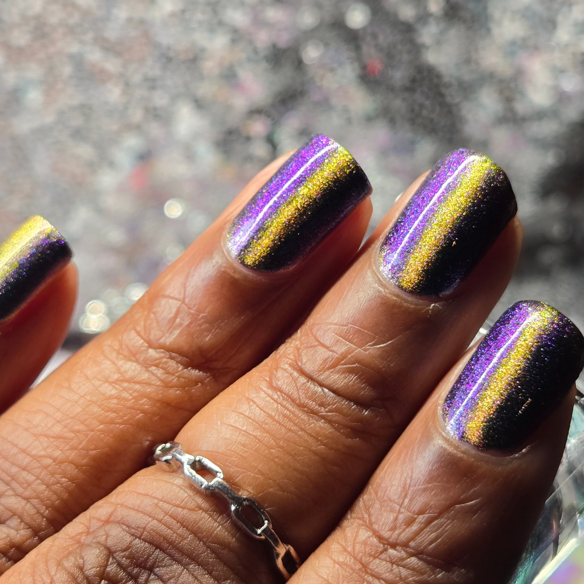 Illustris is a multichrome magnetic nail lacquer that shifts from green to blue to purple with contrasting pink to orange to gold multichrome magnetic shimmer. Illustris is part of the Botanica Collection.