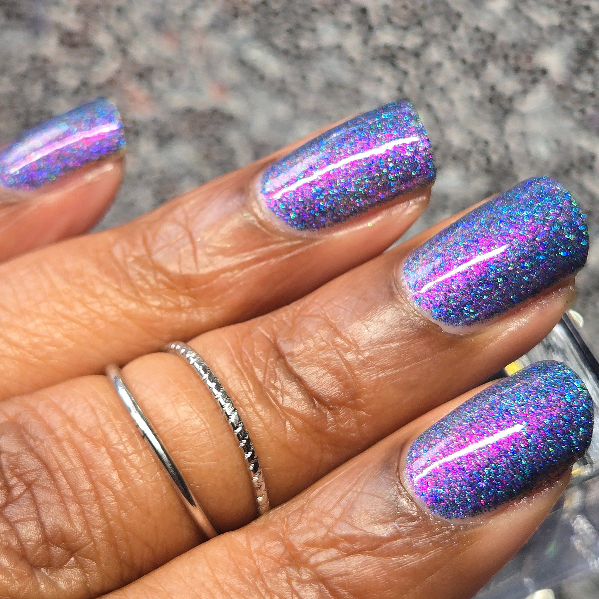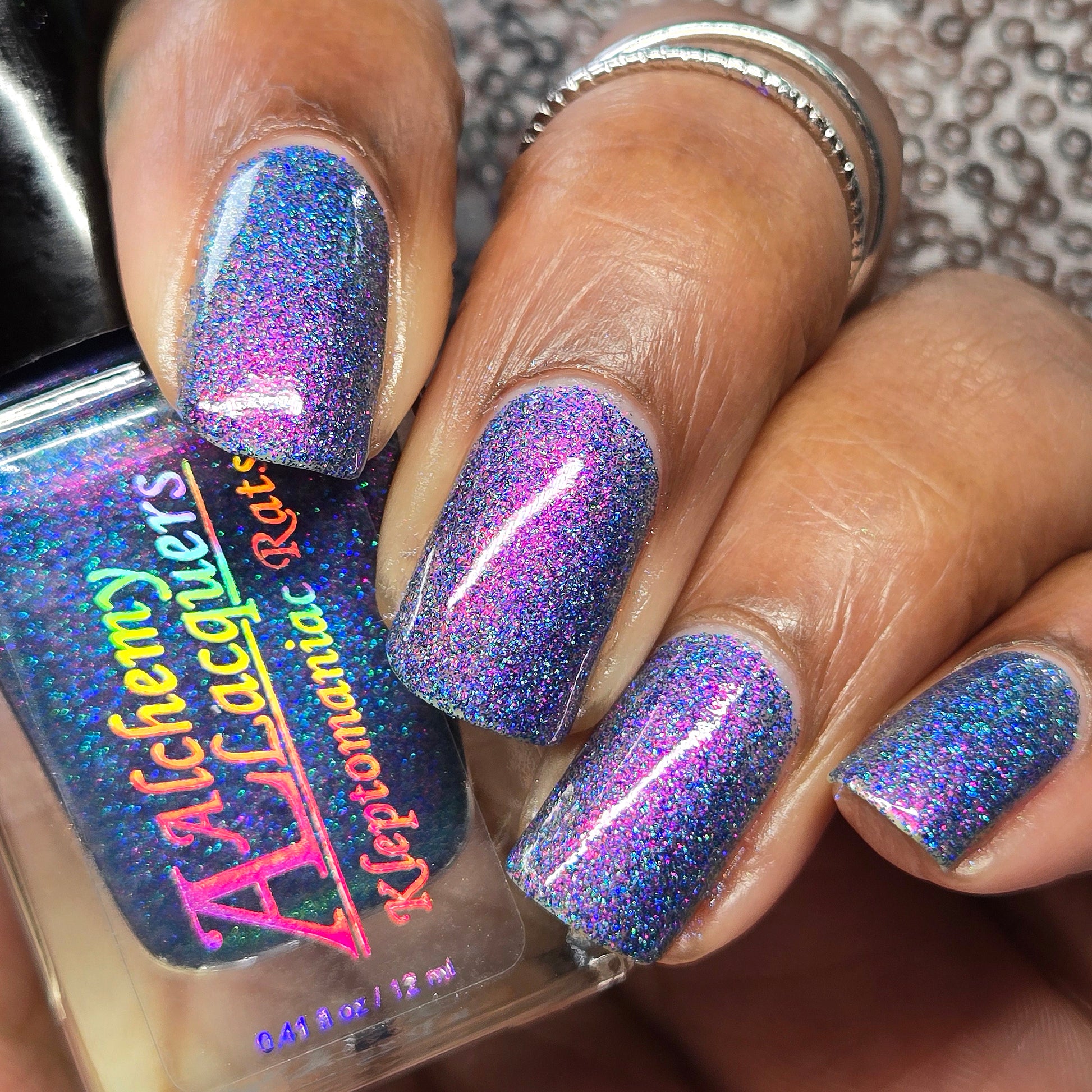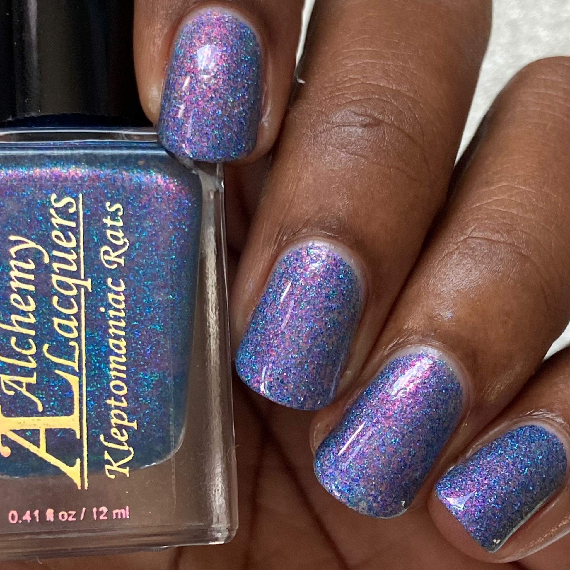 Kleptomaniac Rats is a micro glitter nail lacquer with blue and green micro holographic glitter in a magenta to pink to orange to gold to green (at extreme angles) iridescent shifting shimmer. Kleptomaniac Rats is part of the Stellar Guardians Collection.