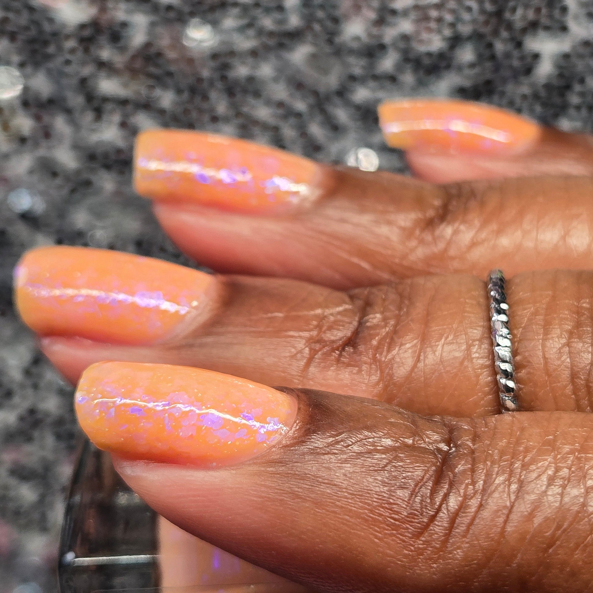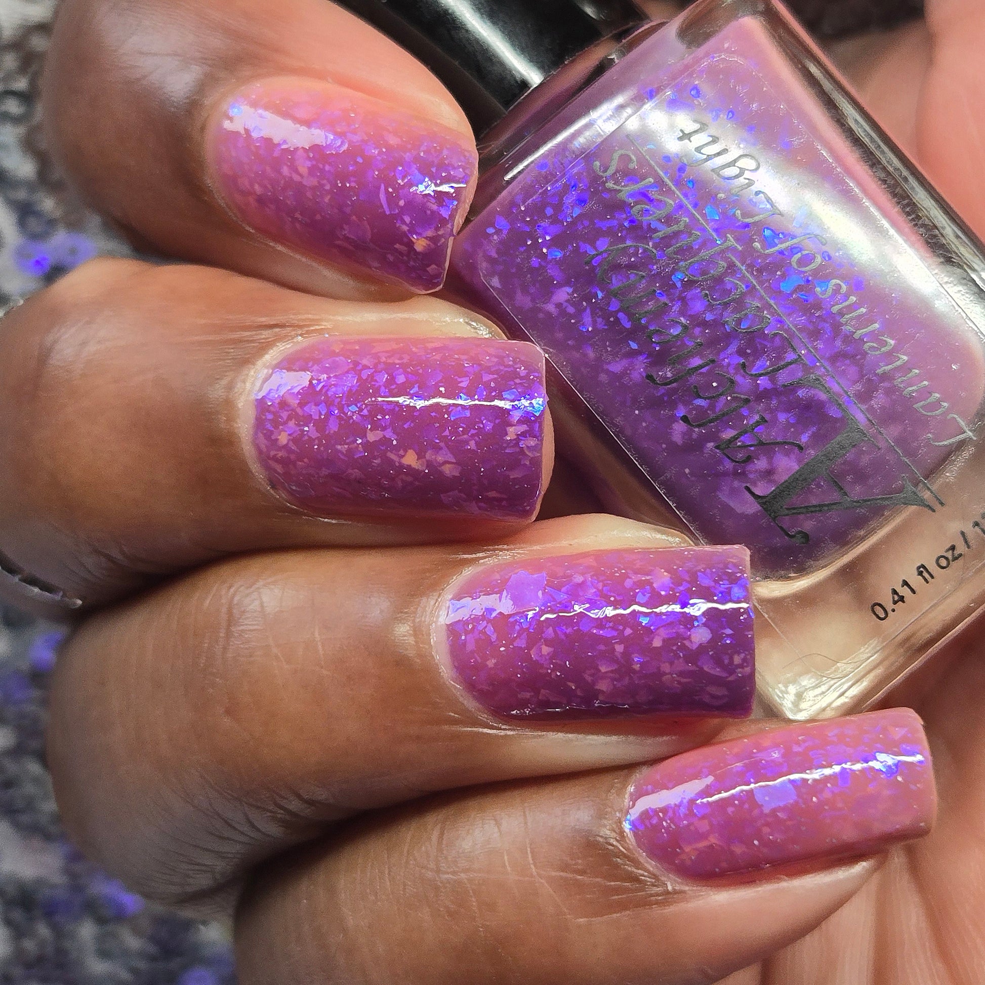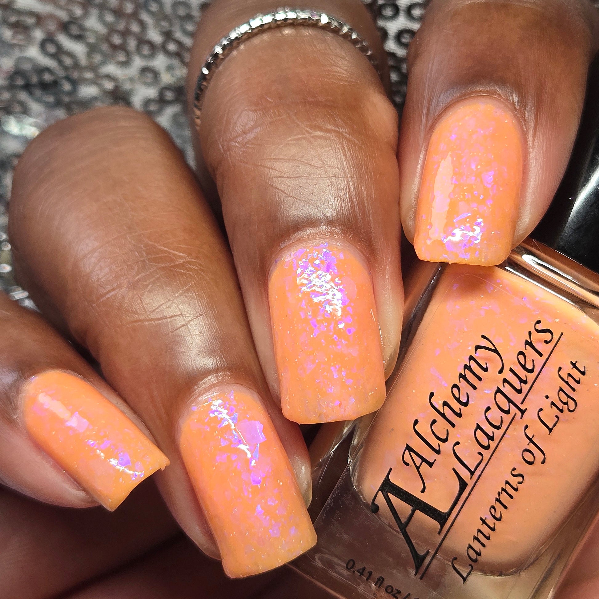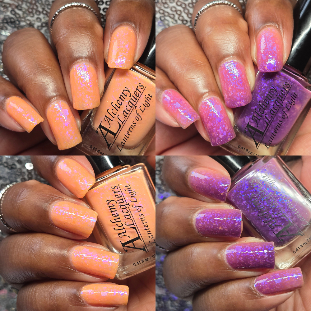 Lanterns of Light Is a solar nail lacquer that shifts from peach (shade) to purple (sun) with contrasting blue to purple shifting iridescent flakes. Lanterns of Light is part of the Shards of Illumination Collection.