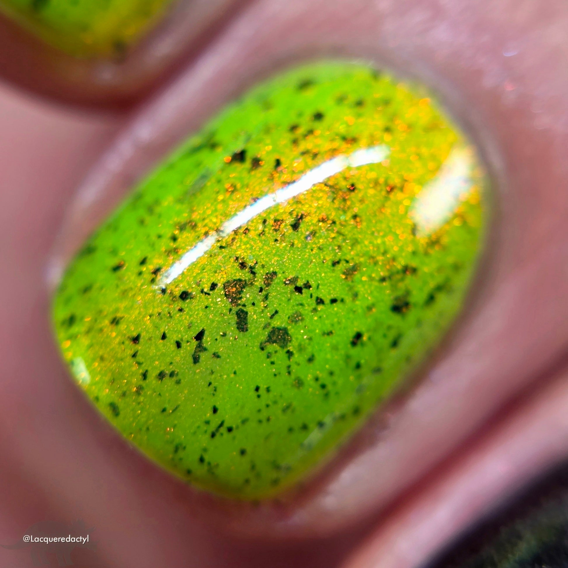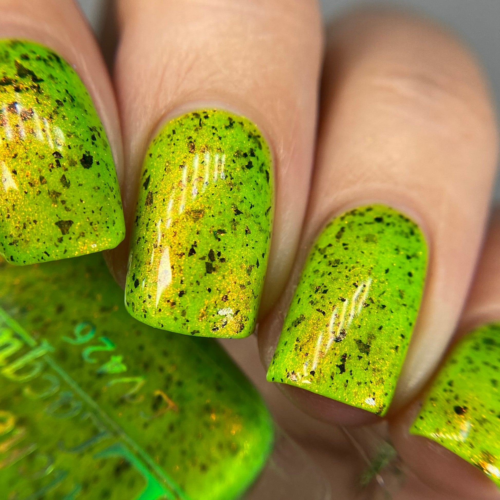 LV426 is a limited edition custom for the Facebook Group, Falloween Polish Lovers, that will be available from October 1 to October 31. LV426 is a bright lime green jelly nail lacquer with black metallic flakes and red to orange to gold shifting iridescent shimmer.