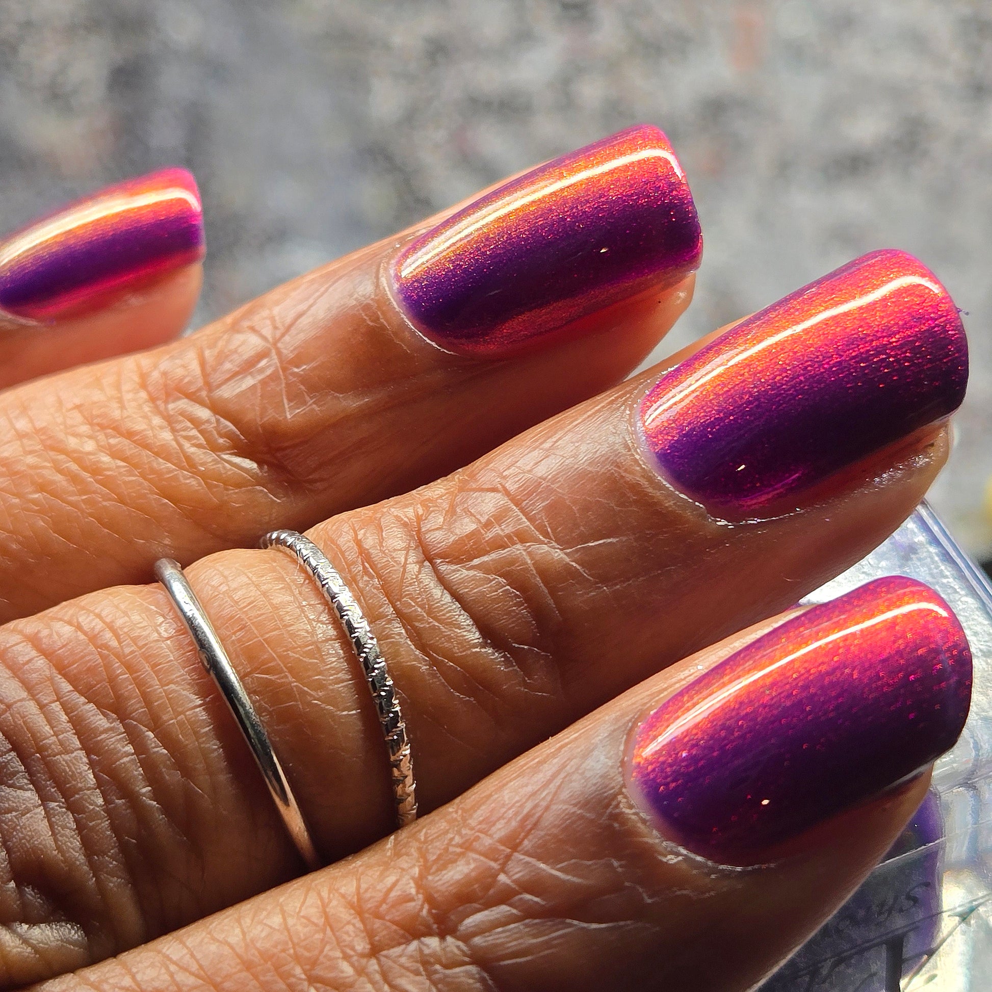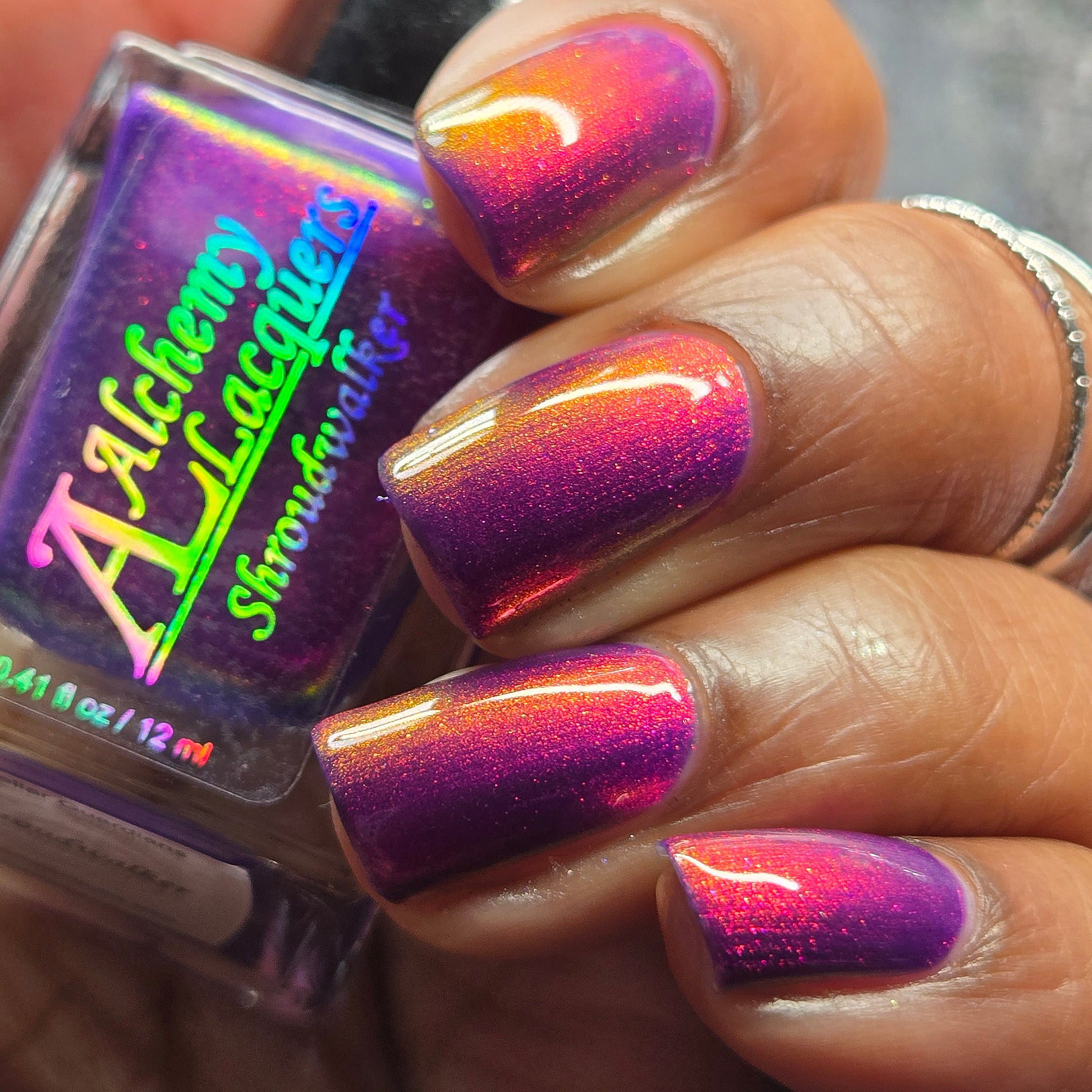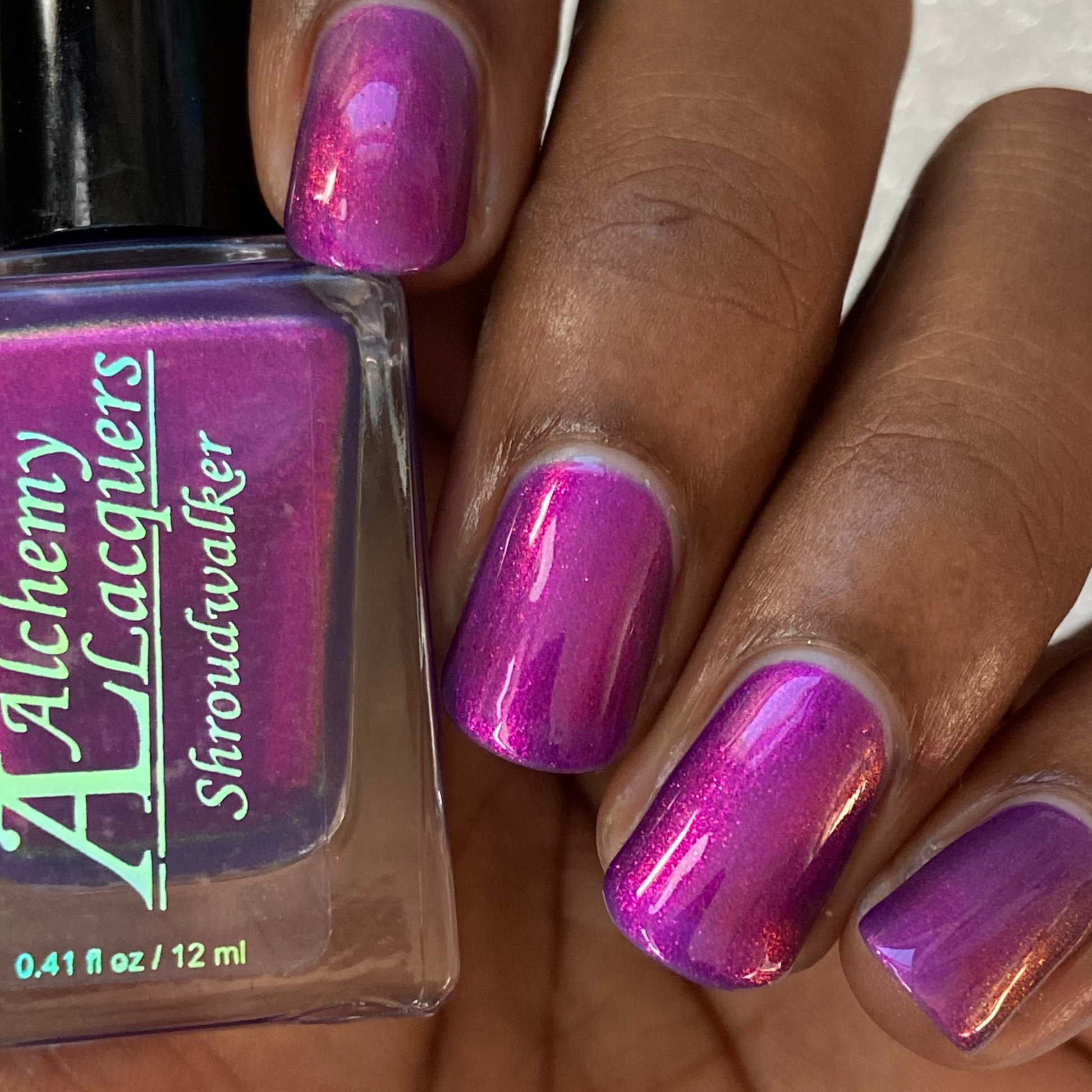 Shroudwalker is a lightly tinted indigo jelly nail lacquer with pink to orange to gold to green (at extreme angles) shifting iridescent shimmer. Shroudwalker is part of the Stellar Guardians Collection.
