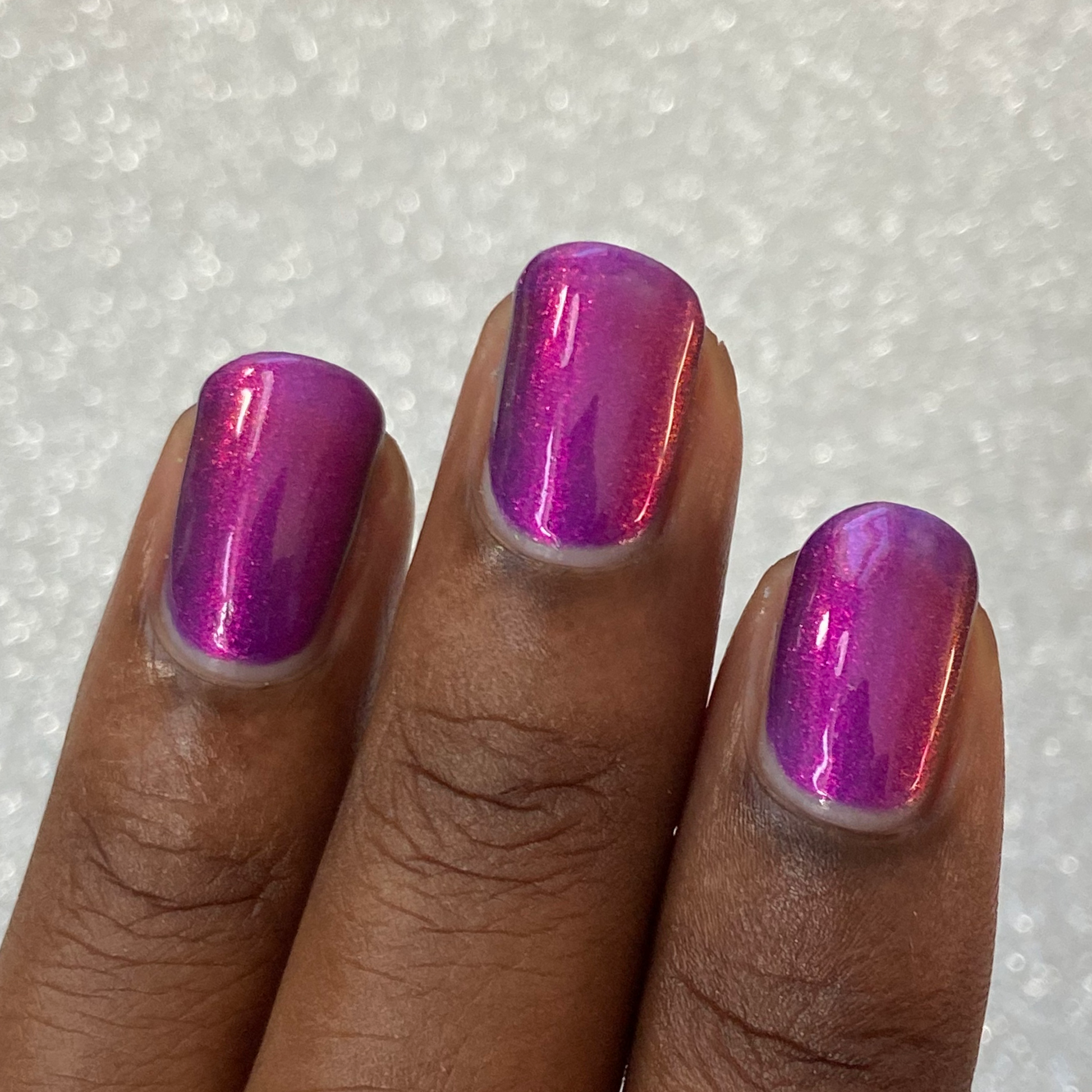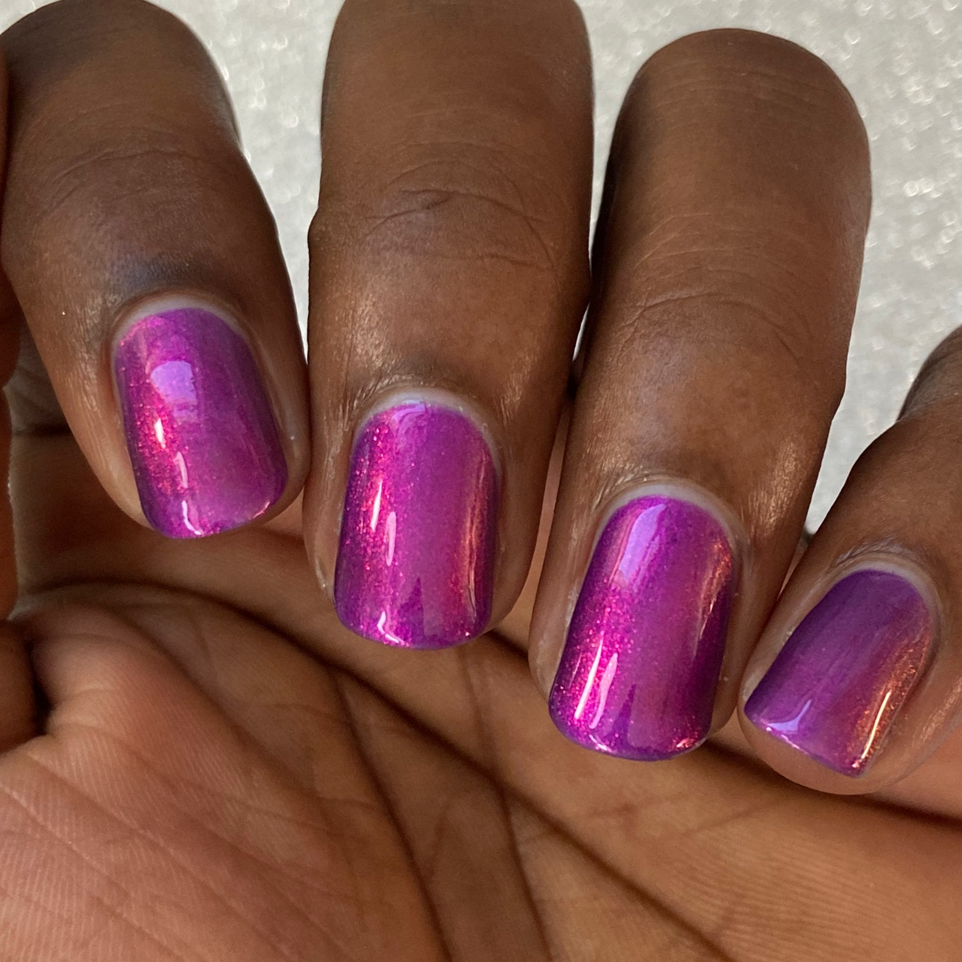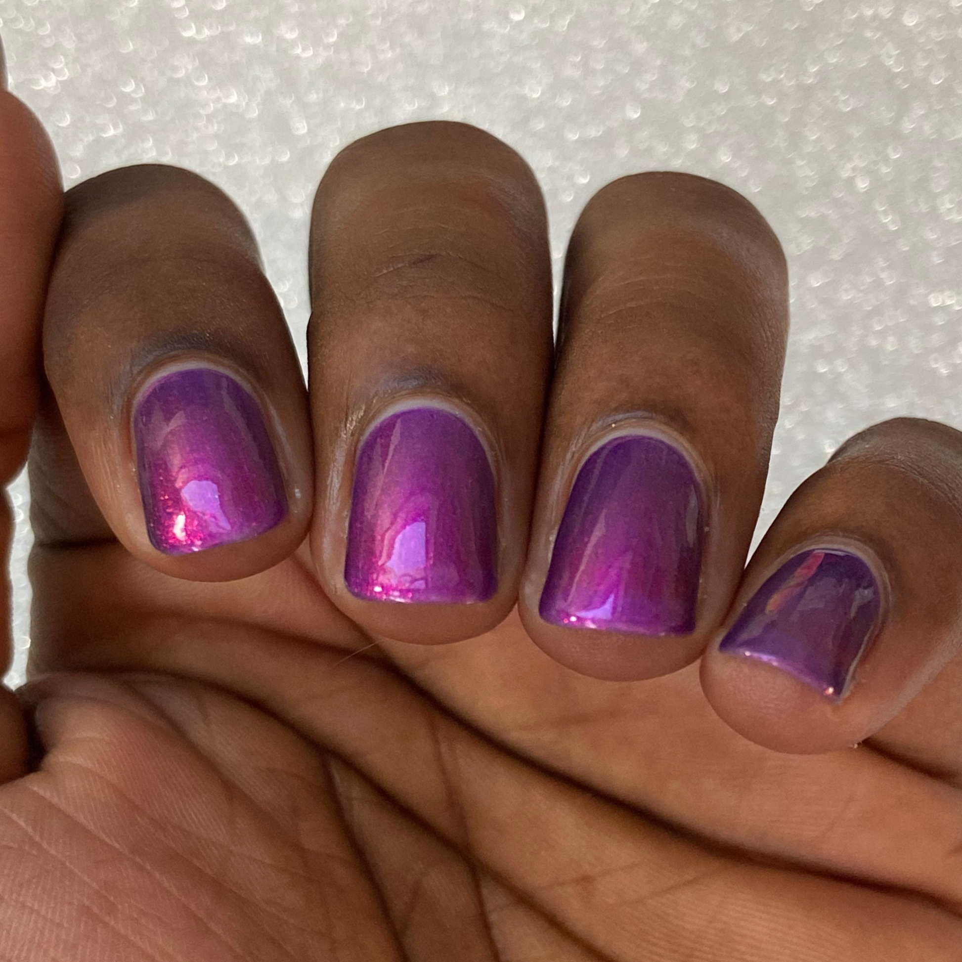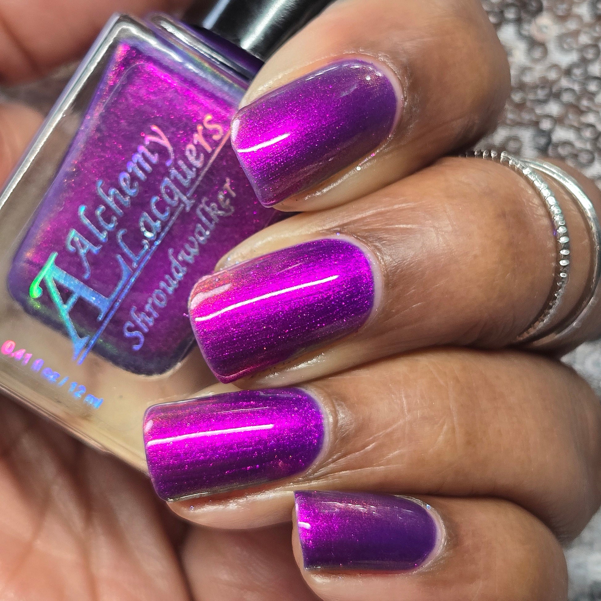 Shroudwalker is a lightly tinted indigo jelly nail lacquer with pink to orange to gold to green (at extreme angles) shifting iridescent shimmer. Shroudwalker is part of the Stellar Guardians Collection.