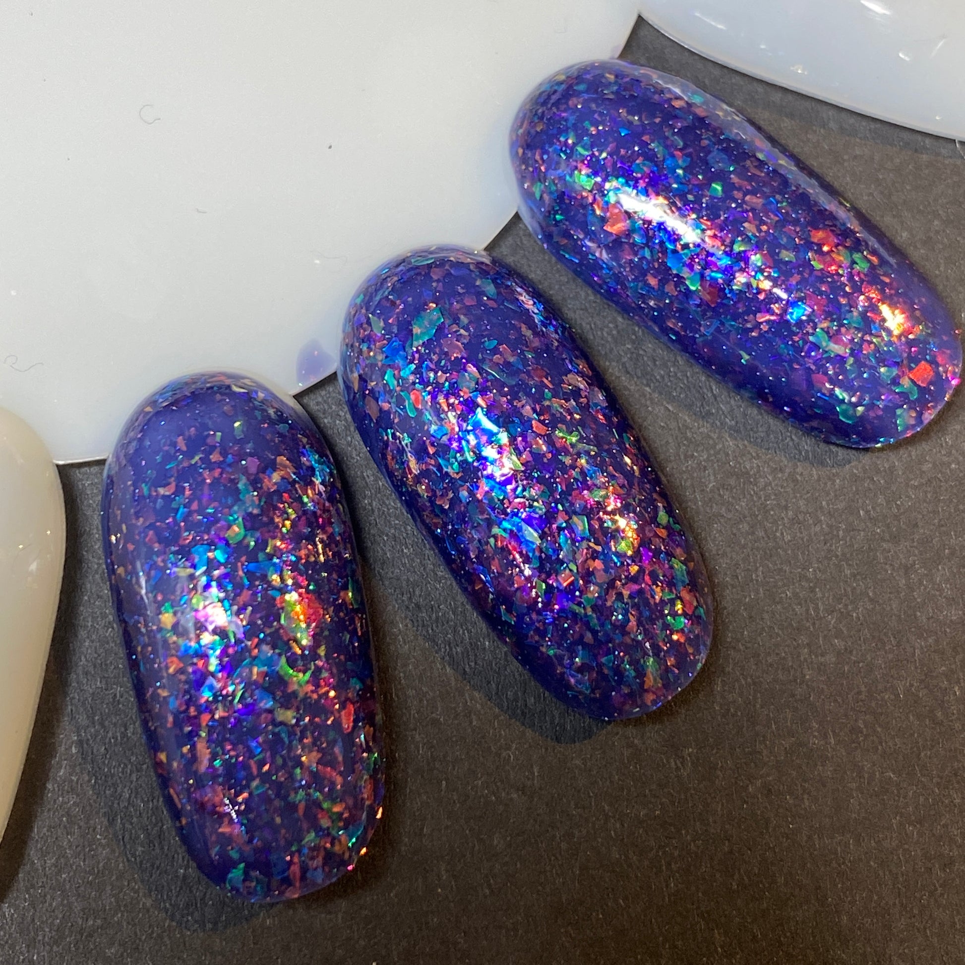 Tonic 59 is a prototype polish. It is a navy blue jelly nail lacquer with a rainbow of shifting iridescent flakes.