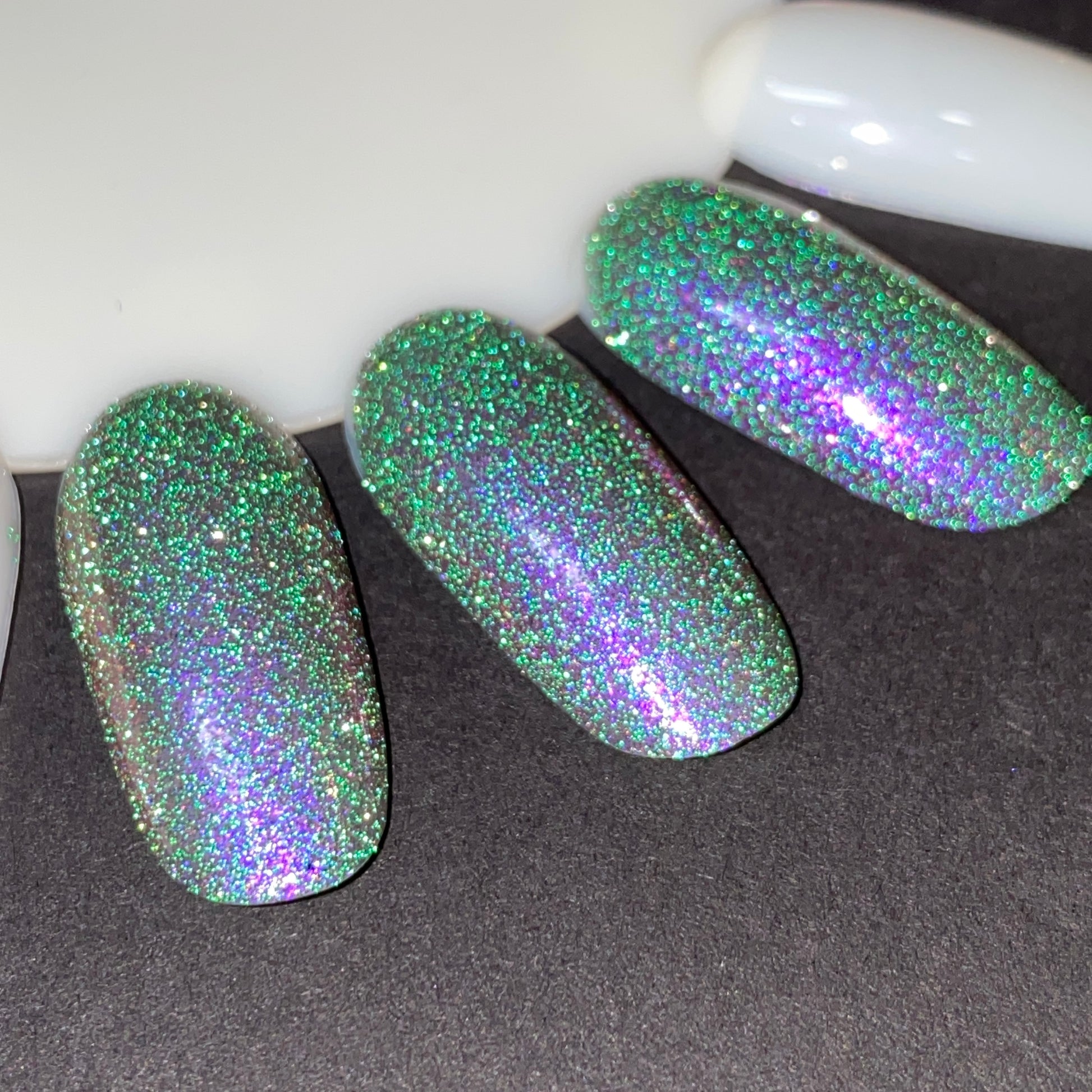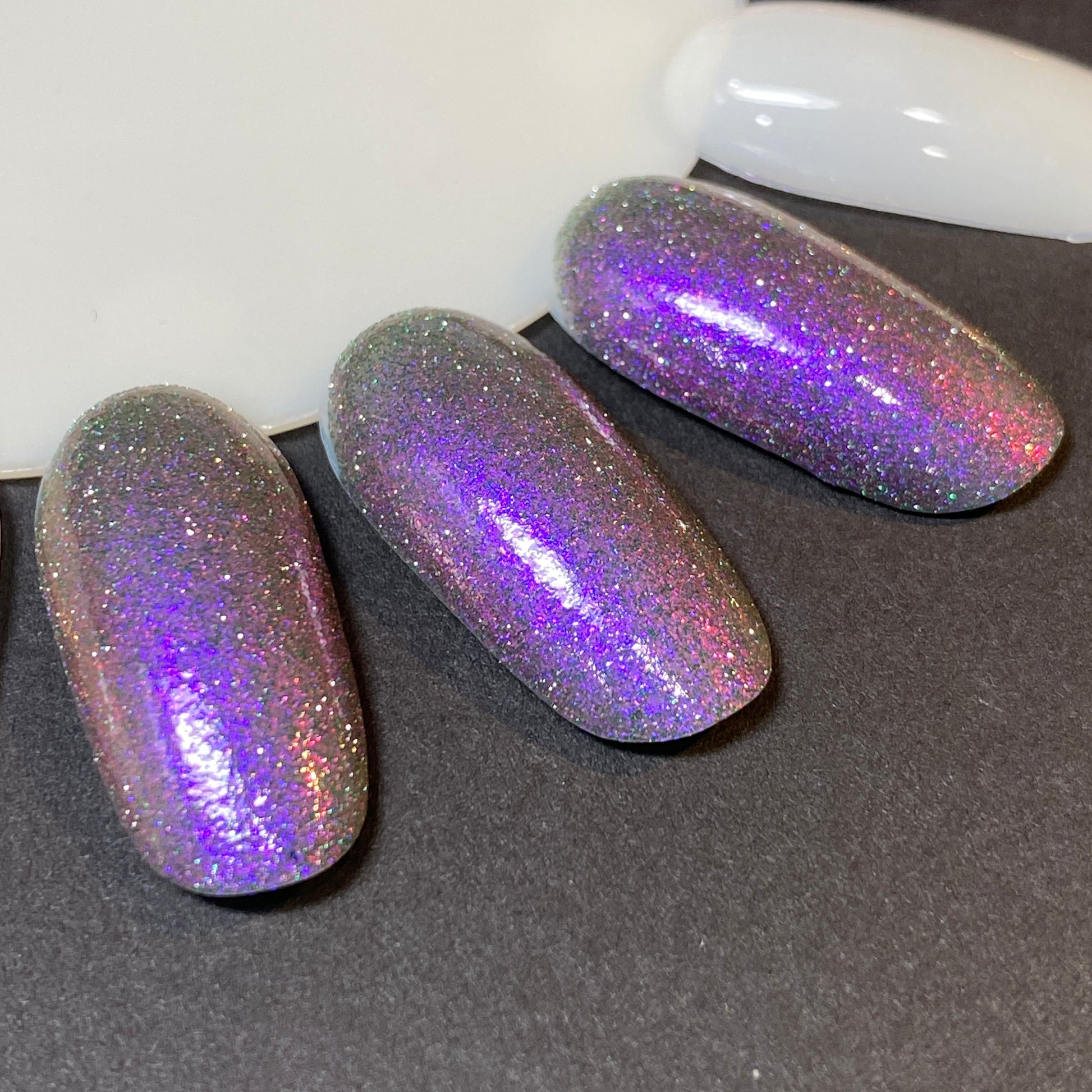 Tonic 61 is a prototype polish. It is a blackened jelly nail lacquer with purple to pink to red iridescent shifting shimmer with green reflective glitter.
